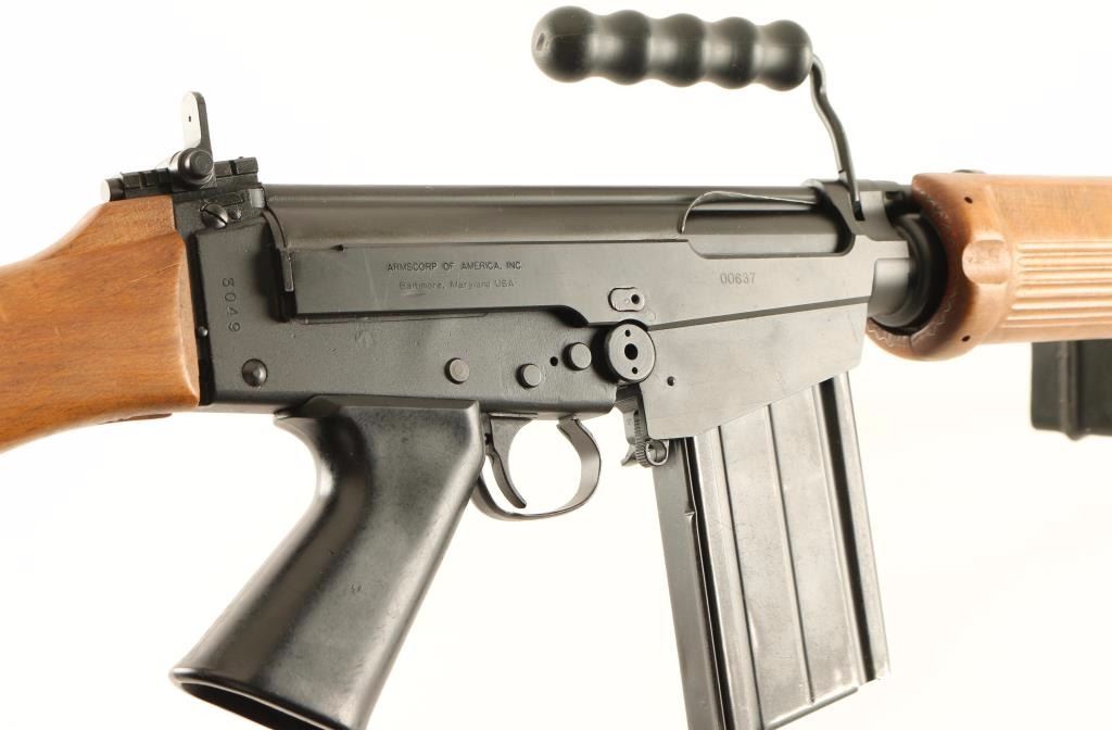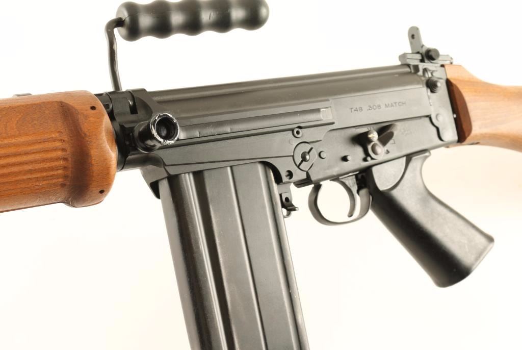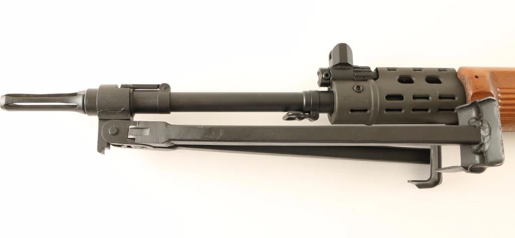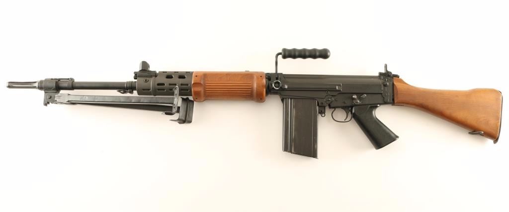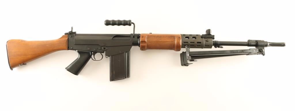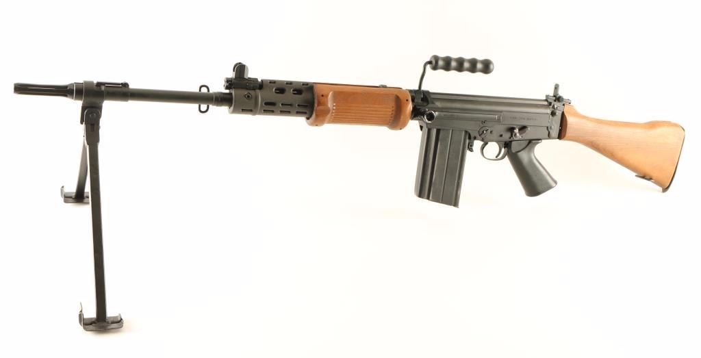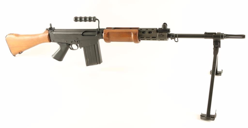 'Pre-ban' Semi-automatic copy of the Israeli FALO battle rifle chambered in 7.62x51mm NATO, circa 1980's. Features a matte black finish, 22" heavy barrel, flash hider, winged post front sight, rear aperture sight on sliding elevation adjustment rail, adjustable gas system, folding bipod, carrying handle, 20 round magazine, thumb safety, smooth trigger, sling swivels, cylindrical charging handle with flared tip, ventilated metal upper handguard, grooved wood handguard, black synthetic pistol grip and smooth wood should stock with hinged butt cover & smooth metal buttplate. Rifle exhibits approximately 96% of it's black finish showing edge wear on the charging handle and a few scratches on the receiver. Action is strong, bore is bright with sharp rifling & light scattered pitting towards the muzzle and wood stocks are fine. Condition is excellent. ***Modern Firearm***