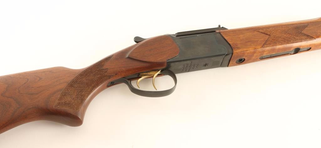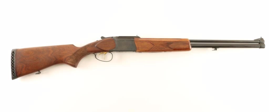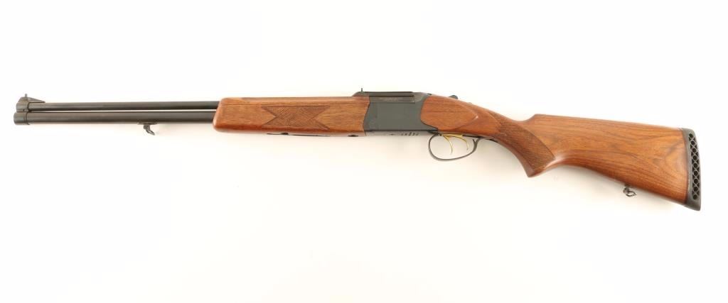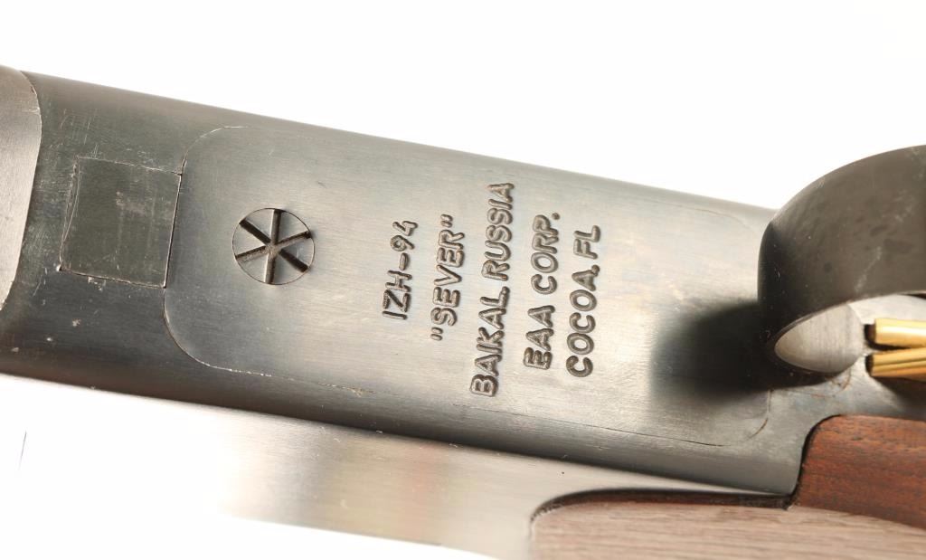 'IZH-94' Russian made boxlock over/under combination rifle & shotgun chambered for .22 Magnum & 3" 20 gauge shells. Imported by EAA Corp of Cocoa, FL with import marks on the receiver. Features a blued finish, 23.5" barrels, extractor, ramped post front sight, scope block with dovetailed rear window sight, double gold trigger, sliding tang safety, checkered top lever, sling swivels, checkered wood forend, smooth handguard and checkered pistol grip shoulder stock with factory recoil pad. Rifle retains approximately 98% of it's original blued finish showing few minor handling marks and a small spot of finish loss on the right side of the barrel near the breech. Action is strong, bores are excellent and wood stocks are near fine. Condition is near excellent. ***Modern Firearm***