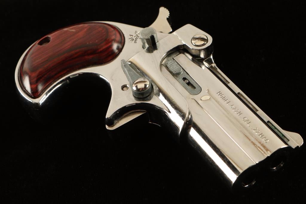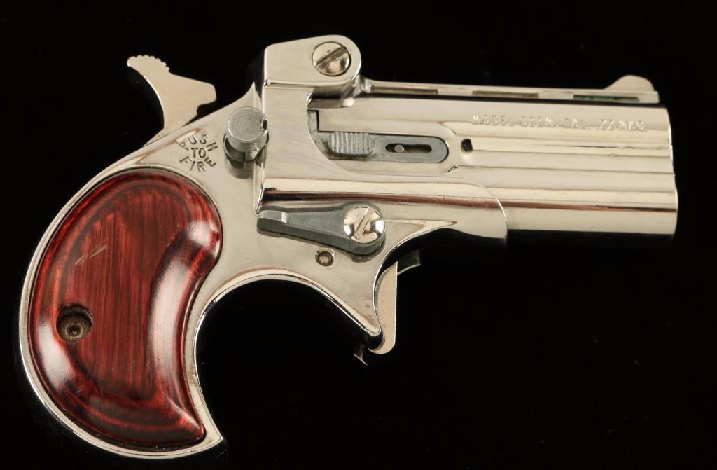 American made over/under double barrel derringer chambered in .22 Magnum. Features a chrome plated finish, 2.3" barrels with faux ventilated top rib, fixed sights, flat spur trigger, push button safety, auto-rotating barrel selector in the hammer, manual ejector, and two-piece smooth rosewood grips. Includes the original factory cardboard box with manual. Derringer exhibits numerous handling marks/fine scratches in the chrome finish with no losses observed. Action is sound, bores are excellent, and wood grips show some minor scuffs. Condition is very good++. ***Modern Firearm***