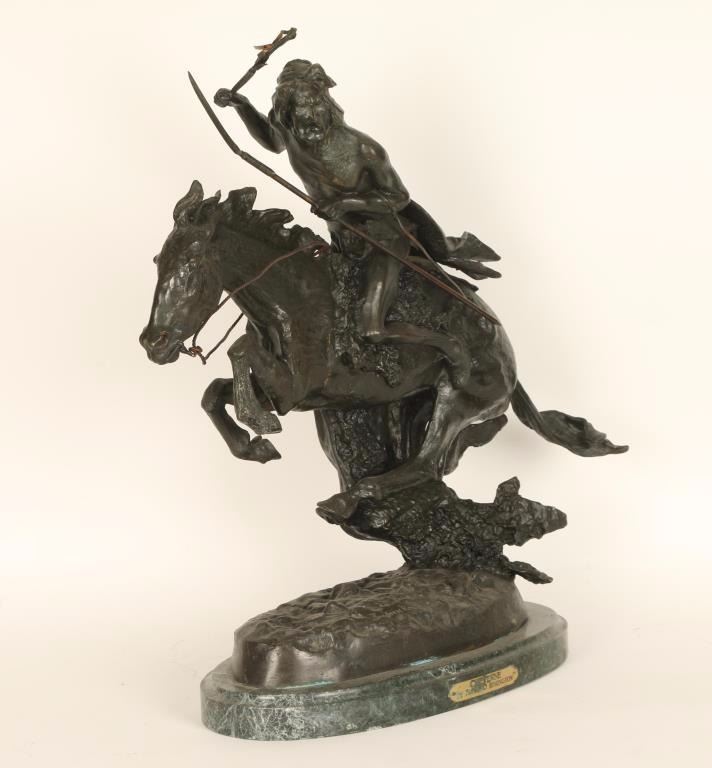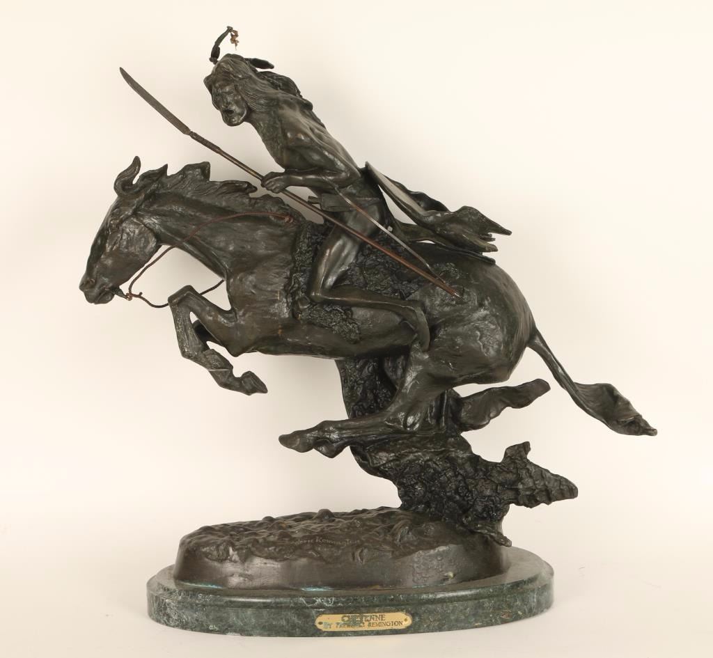"Cheyenne" by Frederic Remington. Restrike on green marble base with brass title plate that shows some tarnish. Measures 21 1/2"h x 21"l x 9"w.