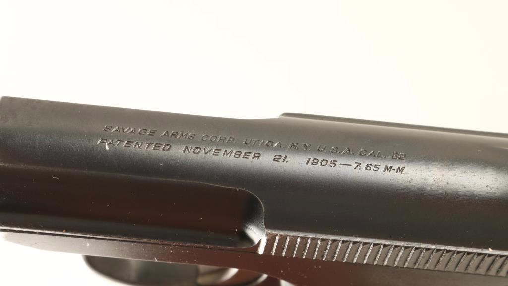 Vintage American made single action semi-automatic pistol chambered in .32 Automatic, circa 1907-1920. Features a quality blued refinish, 3.75" barrel, fixed round blade front sight, square notched rear sight, smooth case hardened trigger, serrated round hammer spur, manual safety, 10 round magazine, steel frame and two-piece checkered black synthetic grips with Savage insignias. Pistol exhibits approximately 80% of it's well accomplished refinish showing light holster wear and scatted oxidation & pin-prick pitting. Action is strong, bore is excellent and synthetic grips are very good. Condition is good++. ***C&R Firearm*** ***Modern Firearm***