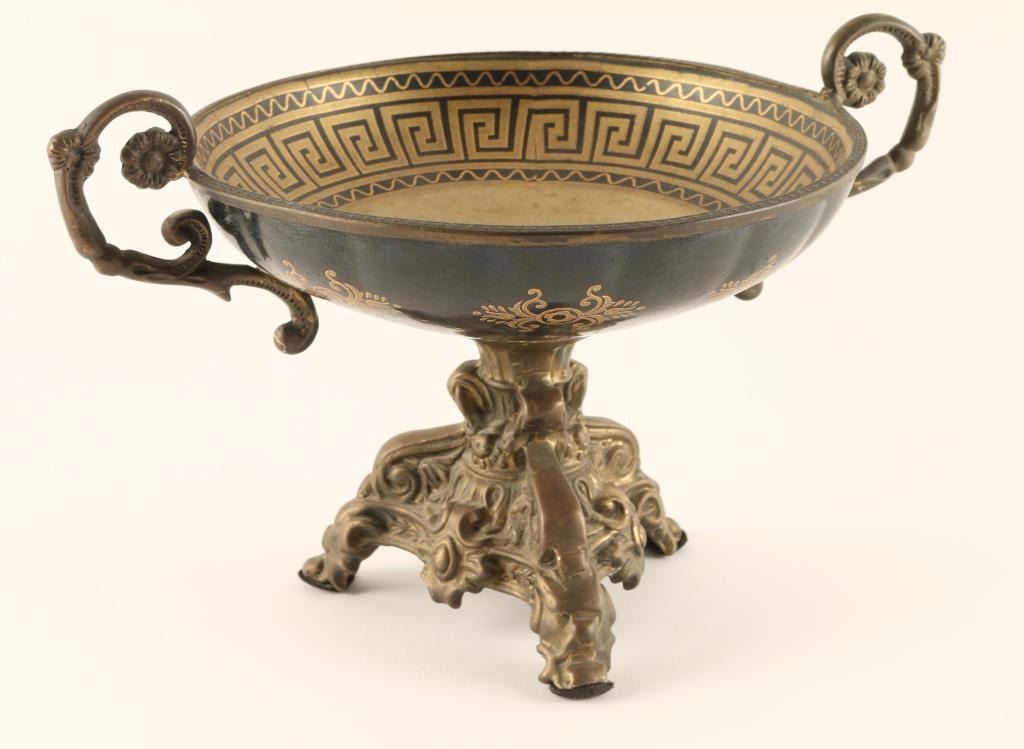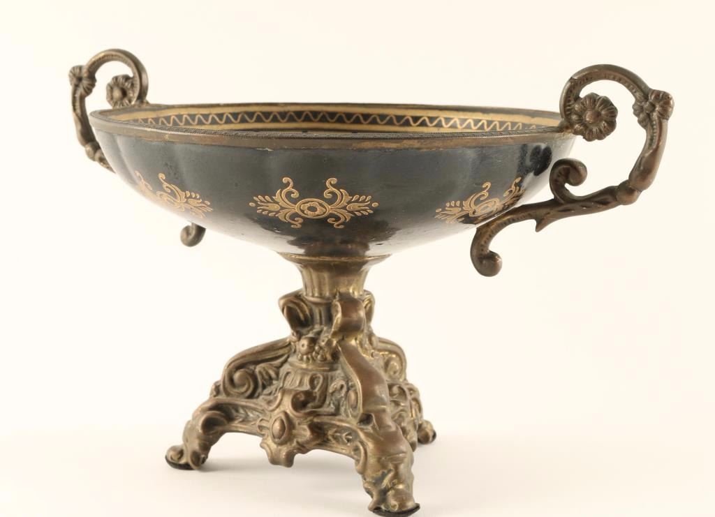Outside of bowl is painted black with a floral motif in gold, inside is a gold Greek key border. Floral design handles grace each side of the bowl with three feet in a scrolled ornate pattern on the bottom. Measures 6 1/2"h x 10 1/2"w x 7 1/2"dia. bowl.