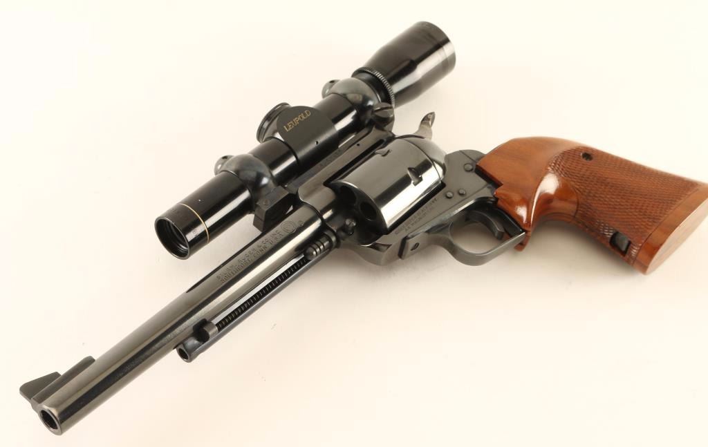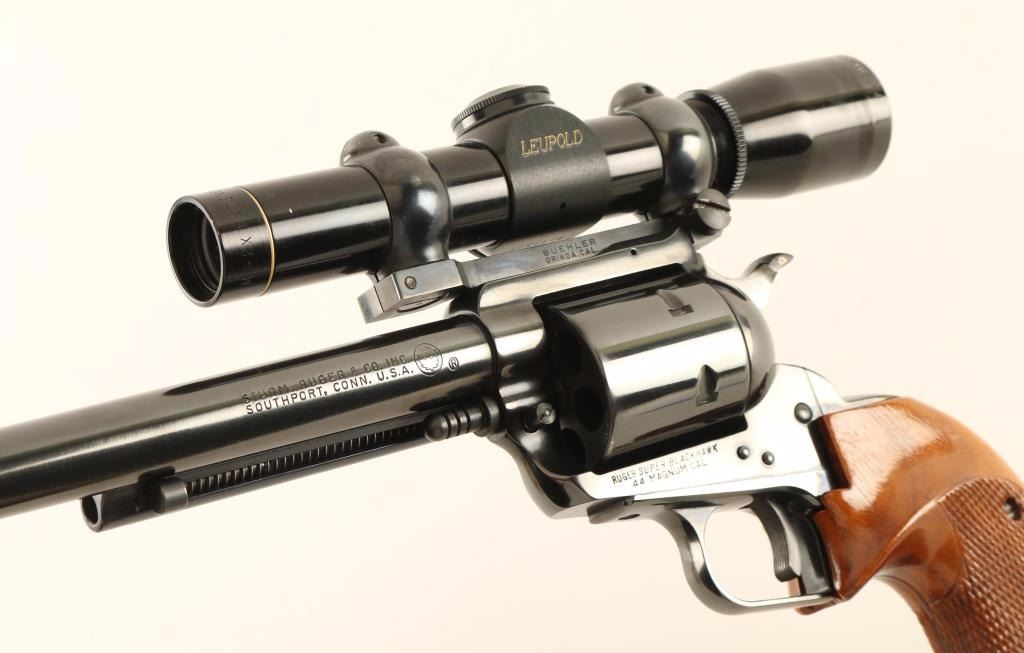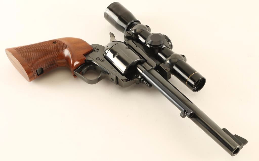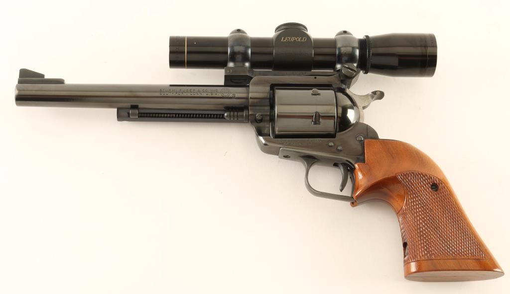 Vintage large frame six-shot single-action revolver chambered in .44 Magnum, circa 1971. Features a blued finish, 7 1/2" barrel, raised ramp front sight, Leupold M8-2x E.E.R. scope on Buehler base, ejector rod, non-fluted cylinder, serrated trigger, serrated wide hammer spur, square-back trigger guard and custom two-piece checkered wood target style grips. Revolver exhibits approximately 95% of its original blued finish showing light muzzle wear, some edge wear on the cylinder, few handling marks, and a faint drag line. Action is smooth with tight lock-up, bore is excellent, optics are sharp and wood grips are fine. Condition is near excellent. ***Modern Firearm***