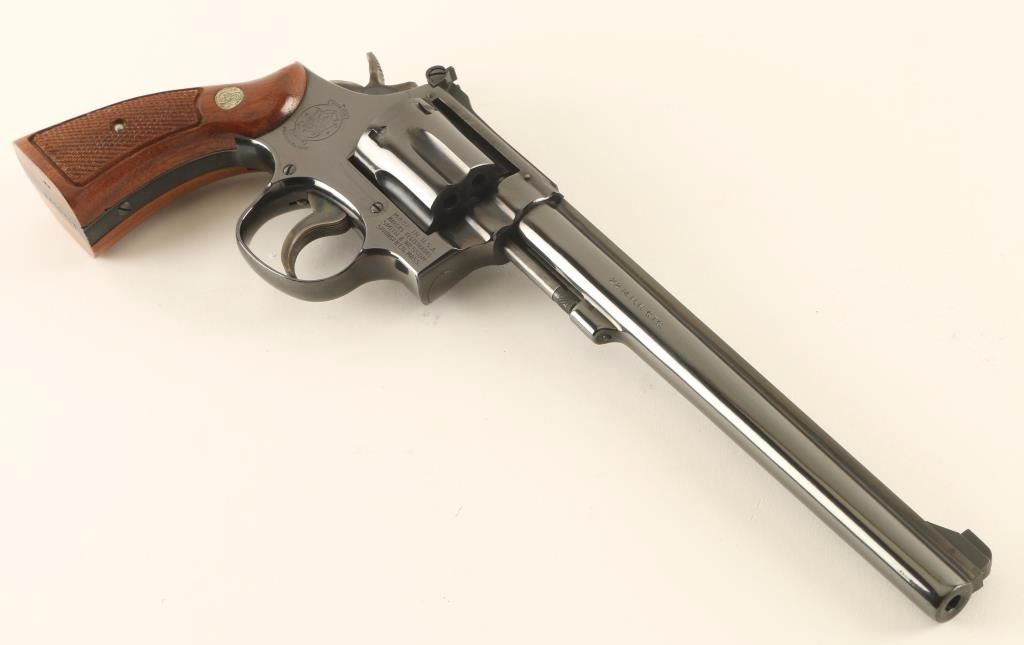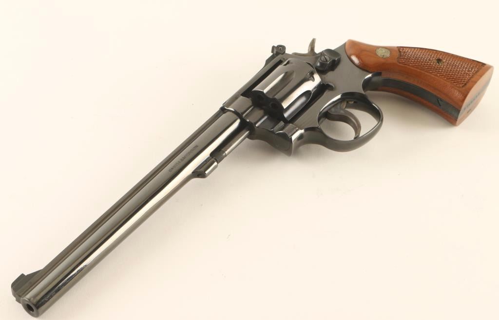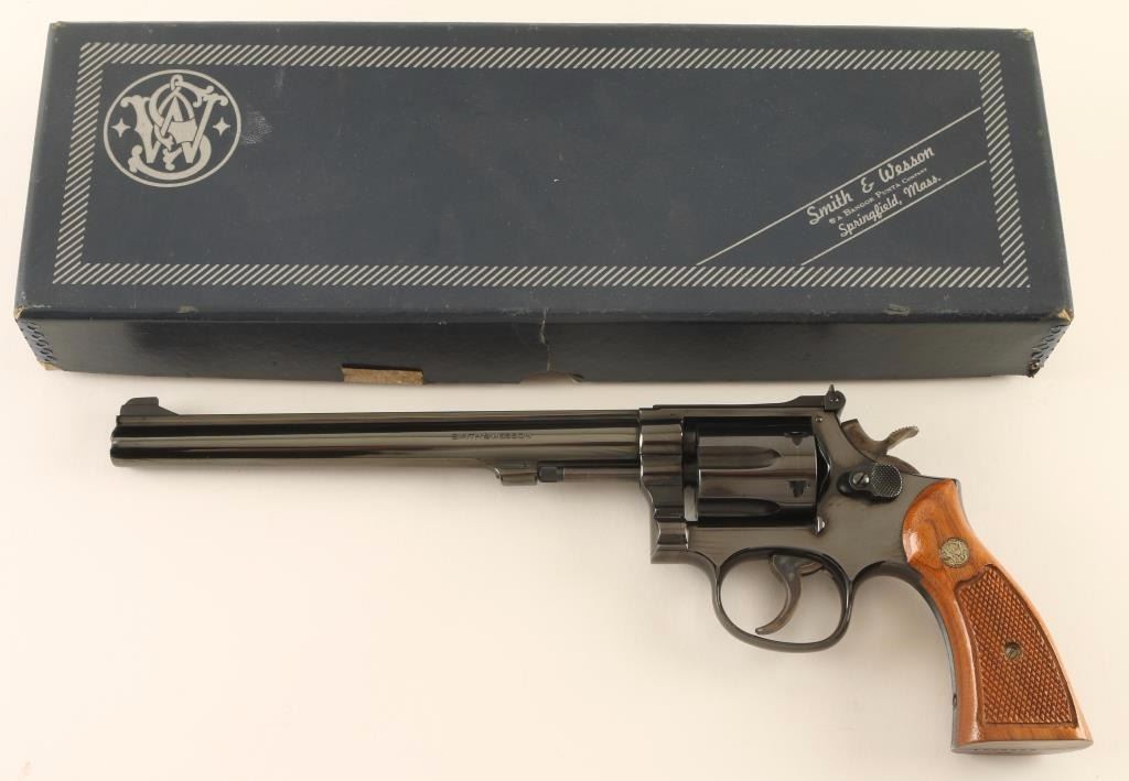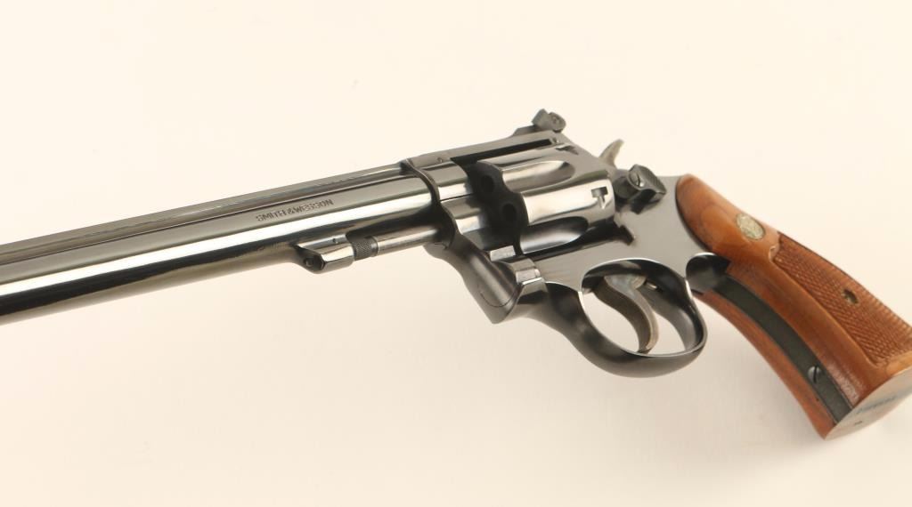 'K-22 Masterpiece Magnum' Medium frame double-action revolver chambered in .22 Winchester Magnum Rimfire, circa 1977-1982. Features a blued finish, pinned 8 3/8" barrel with serrated top rib, ramped patridge front sight, adjustable micrometer click rear window sight, fluted six-shot cylinder with recessed chambers, non-shrouded ejector rod, .265" serrated service trigger, .375" semi-target hammer, square butt K target frame with ten groove grip straps, and two-piece checkered walnut Magna grips with silver Smith & Wesson medallions. Includes the original factory cardboard box with documents. Revolver exhibits approximately 97% of it's original blued finish showing slight muzzle wear, few handling marks and a faint drag ling on the cylinder. Action is smooth with solid lock-up, bore is excellent, and matching wood grips are fine. Condition is excellent in box. ***Modern Firearm**