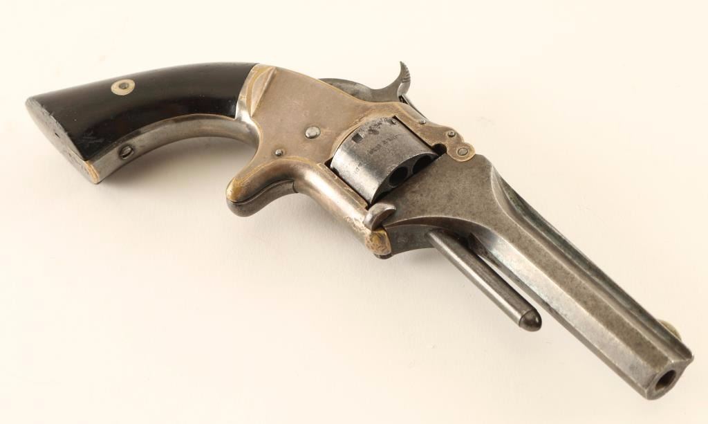 Antique small frame single-action spur trigger revolver chambered in .22 Short, circa 1860-1868. Features a blued/silver plated finish, 3.2" ribbed octagonal barrel, round blade front sight, notched rear sight, seven-shot non-fluted cylinder, smooth spur trigger, checkered hammer spur, and two-piece rosewood grips. The right grip is serial numbered to the gun and the ejector rod is missing from the barrel. The barrel looks to have been reblued and exhibits approximately 60% of it's thinning finish. The cylinder bears a grey patina with some scattered pin prick pitting and the frame retains approximately 30% of it's thinned silver finish. Working the action will rotate the cylinder but the hammer will not stay cocked, markings are very good, bore is fair with some dark pitting and wood grips are good+. Condition is very good. ***Antique Firearm***
