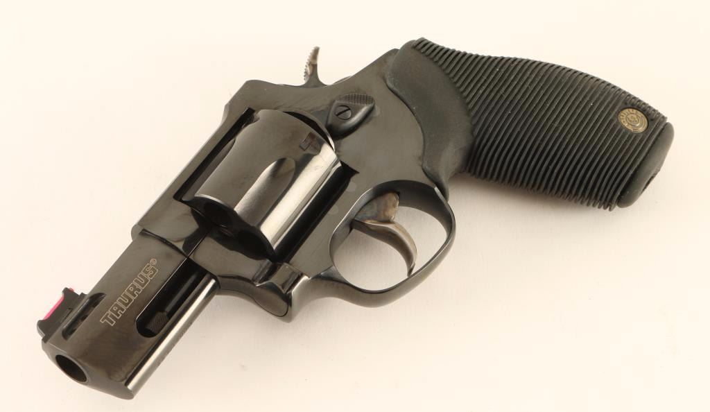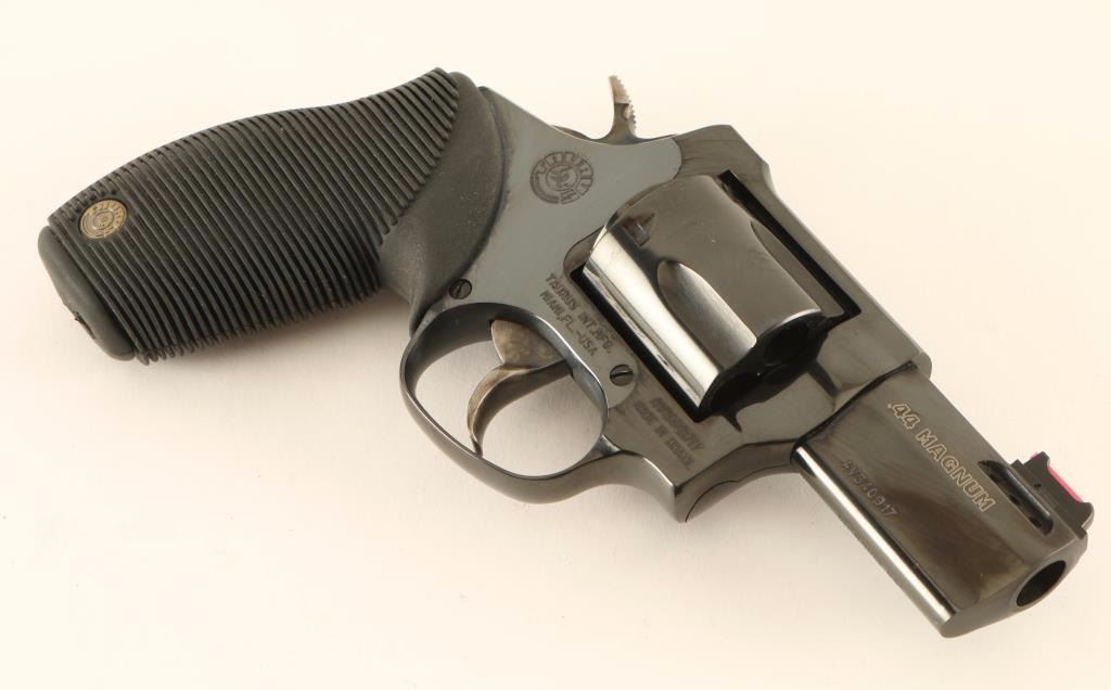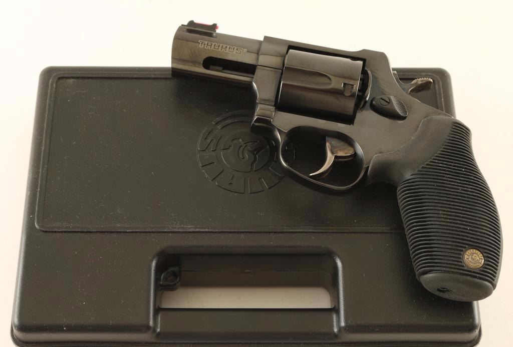 Brazilian made medium frame snub-nosed double-action revolver chambered in .44 Magnum. Features a blued finish, 2 1/2" ported barrel with full underlug, fiber-optic front sight, square notched rear sight, fluted five-shot cylinder, smooth combat trigger, semi-target hammer with internal key lock, and one-piece ribbed black rubber grip with Taurus medallions. Includes the original factory hard case with documents and keys. Revolver exhibits approximately 97% of it's original blued finish showing light wear, a few minor handling marks/scratches and a faint drag on the cylinder. Action is smooth with solid lock-up, bore is very good and rubber grips are fine. Condition is excellent in box. ***Modern Firearm***