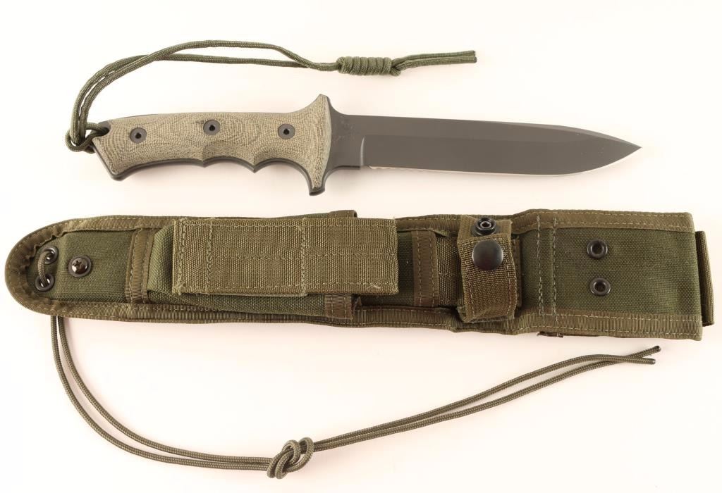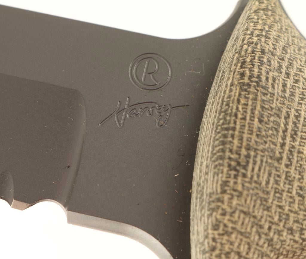 Designed and engineered by Chris Reeve and William W. Harsey. Dorsal tapered profile black PVD blade and Rockwell hardness of 55-57 with a contoured canvas micarta handle. Marked with Chris Reeve logo and 'Harsey' Measures 12 1/4" overall with a 7" blade. Comes with a green canvas sheath.