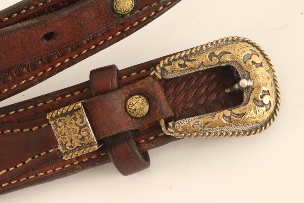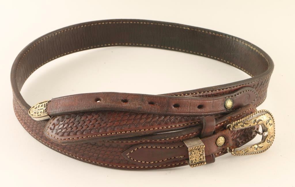 Hand made and engraved sterling silver and gold overlay buckle, keeper and tip on a brown basket weave stamped belt. Very nice ensemble.