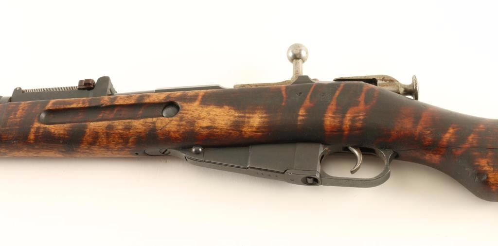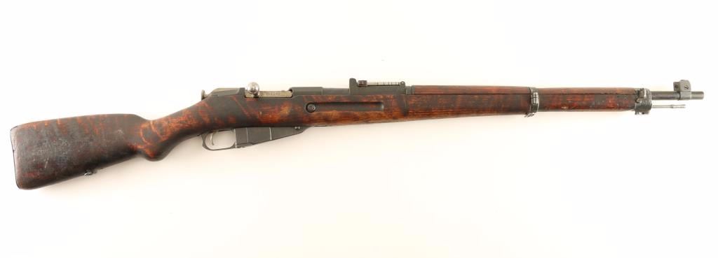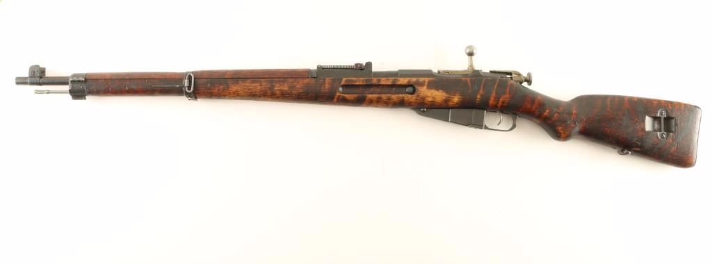 Finnish military bolt action service rifle chambered in 7.62x54Rmm, circa 1944. Imported by C.A.I. of Georgia, V.T, with import marks on the barrel. Features a blued finish, Sako marked 27" barrel, winged front sight, flip-up ladder rear sight graduated to 2,000 meters, hinged front barrel band with bayonet lug, cleaning rod, octagonal receiver, straight bolt handle, 5 round internal box magazine, sling swivels, smooth wood handguard and finger-jointed semi pistol grip shoulder stock with faint Sako stamp & smooth metal buttplate. Serial numbers match on the barrel, bolt & receiver(importer marked). Rifle retains approximately 60% of it's blued finish showing scattered oxidation and a small amount of surface rust. Action is smooth, bore is semi-bright with decent rifling, and wood stocks are good showing an old repair at the wrist. Condition is good. ***C&R Firearm*** ***Modern Firearm***
