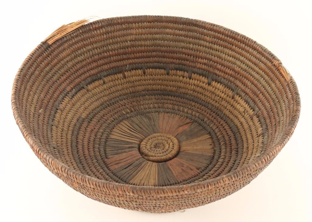 Handwoven with red, black, sage, and tan colors. Pinwheel design around the coil in center inside of basket. Measures 5 1/2"h x 14"dia. Some fraying around top edge otherwise good. From the Fort Hunter Museum per consignor.