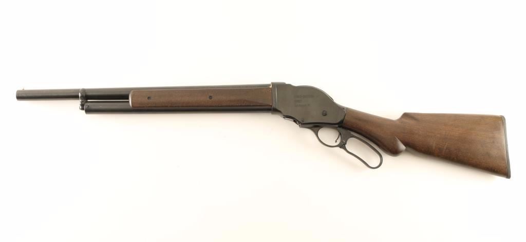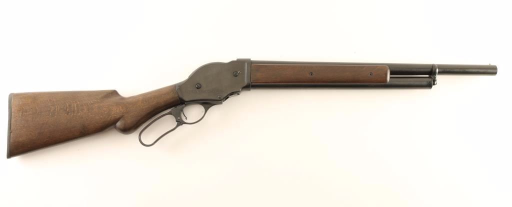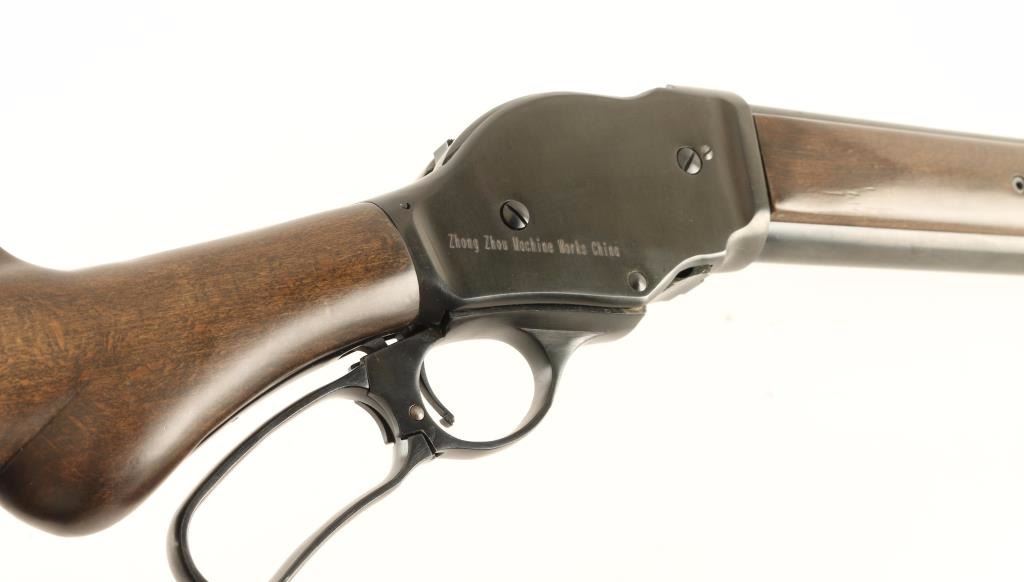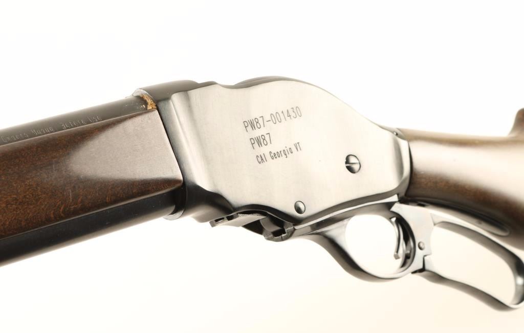 SN: PW87-001430 Chinese made reproduction of the Winchester 1887 lever action repeating shotgun, chambered for 2 3/4" 12 gauge shells. Imported by C.A.I. of Georgia, V.T. with import marks on the receiver. Features a blued finish, 20" barrel, brass bead front sight. 3/4 length magazine tube, partially shrouded hammer with serrated spur, two-piece smooth wood forend and pistol grip shoulder stock with checkered black synthetic buttplate. Shotgun exhibits approximately 94% of it's blued finish showing light wear on the moving parts as well as some scattered handling marks. Action performs well, bore is very good+ and wood stocks are near fine with minimal blemishes. Condition is very good+++. ***Modern Firearm***