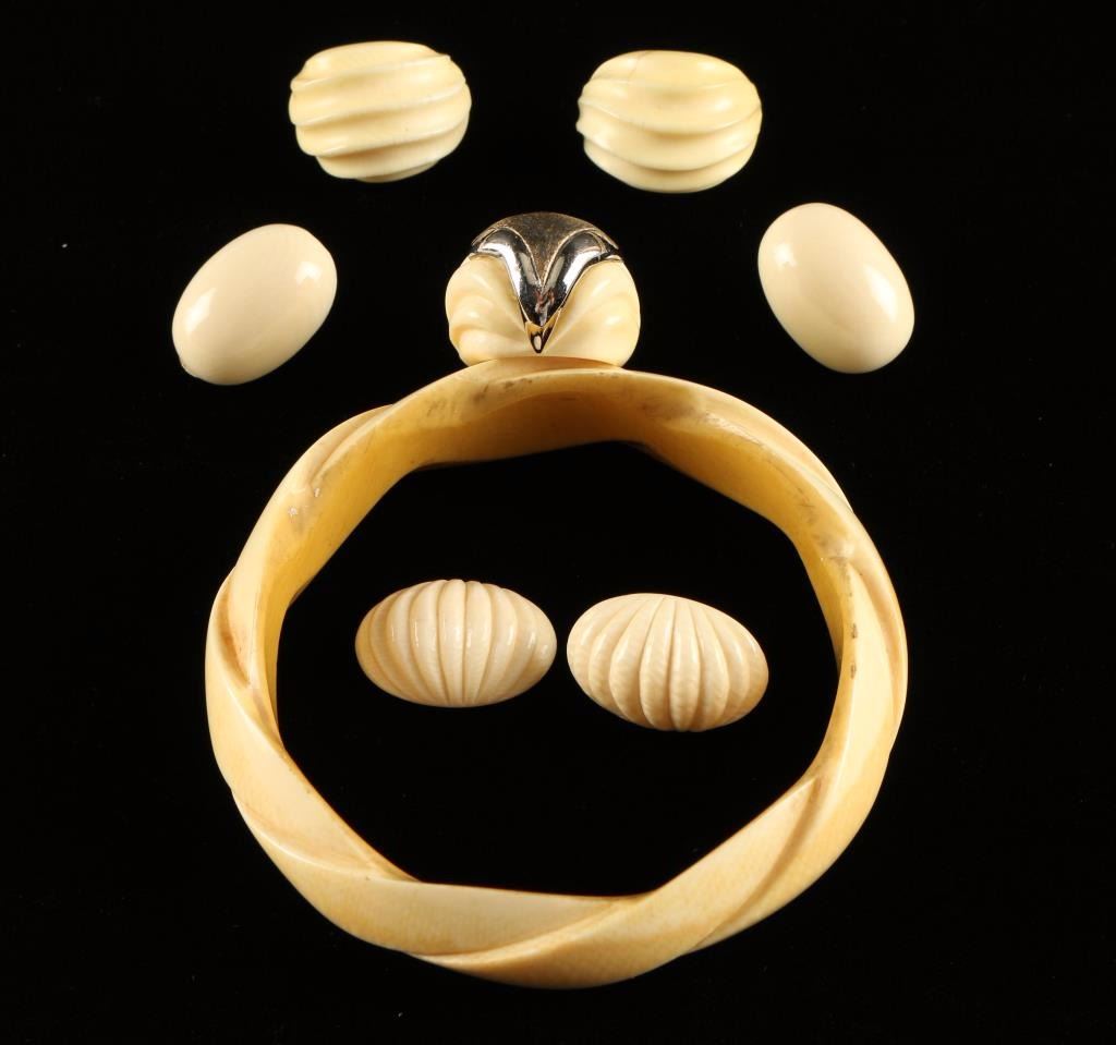 Including; Twisted bangle bracelet, two pierced earrings, two clip on earrings and another pair of clip on earrings missing the back, ivory ring, beaded ivory necklace with a 2" carved geisha, and a six strand ivory necklace with a swan ivory pendant that interlocks. Can only be sold in the state of Arizona by law and commerce.