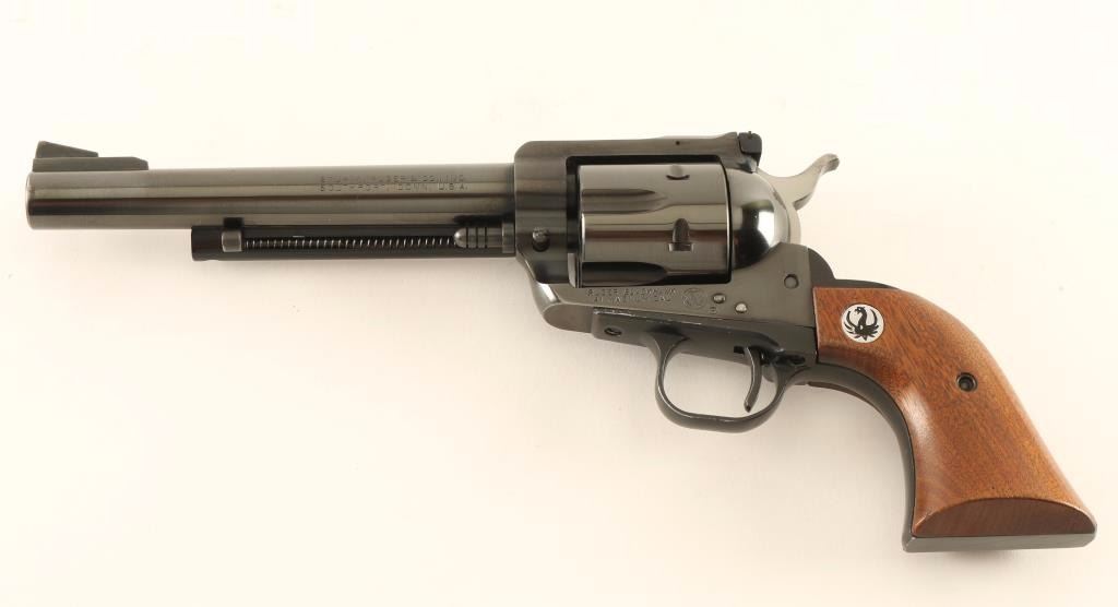Vintage American made six-shot single action revolver chambered in .41 Magnum, circa 1967(third year production.) Features a blued finish, 6 1/2" barrel, raised ramp front sight, adjustable rear window sight, ejector rod, fluted cylinder, flat top three-screw frame, smooth trigger, serrated hammer spur, black anodized aluminum alloy grip frame and two-piece smooth walnut grips with Ruger medallions. Revolver exhibits approximately 97% of it's original blued finish showing only light holster wear and minor handling marks. The grip frame shows some light edge wear on the trigger guard below the trigger and on the left & right side where it meets the frame Action is smooth with tight lock-up, bore is pristine and wood grips are fine. Condition is excellent. ***C&R Firearm*** ***Modern Firearm***