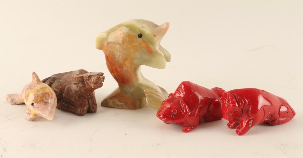 2 Coral Asian carving one frog one bull, 2 stone dolphins, and a stone bull.