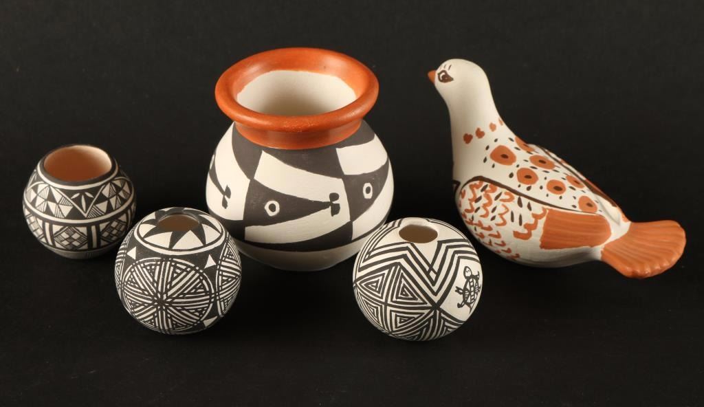Including; pot signed A. Aragora, dove effigy by Dora Isleta, and 3 geometric polychrome pots.