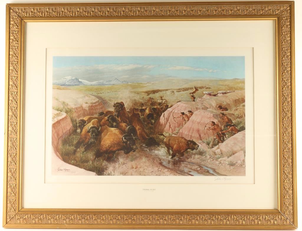 "Tribal Hunt" hand signed in pencil lower right. Image measures 15"x24" in single white pebbled mat with a molded gold wood frame. Title and artist stamped on bottom of mat. John Clymer was strongly influenced by N.C. Wyeth in illustration and became a noted painter of animals and western history. His first illustrations were for Canadian publications, and then he illustrated for pulp magazines and novels, which led to assignments with American magazines and advertising companies. He did a series of historic paintings about the United States Marine Corps during World War II. His illustration career continued for over forty years and included work for Field and Stream and Saturday Evening Post for which he did about ninety covers. Also, he illustrated the book, The Yearling.