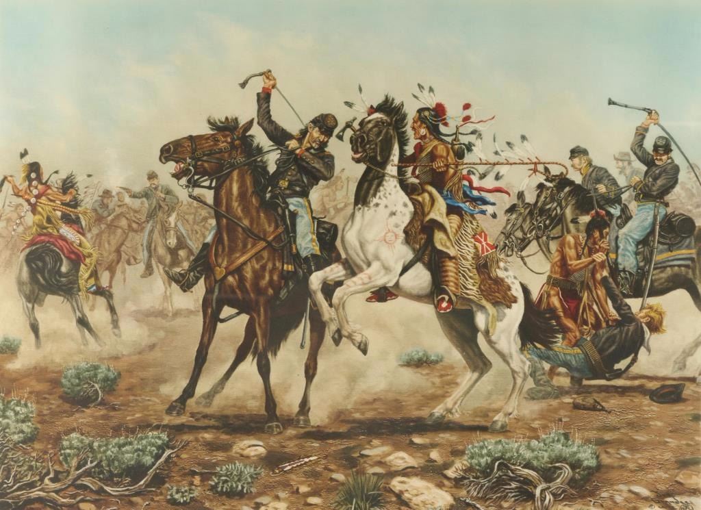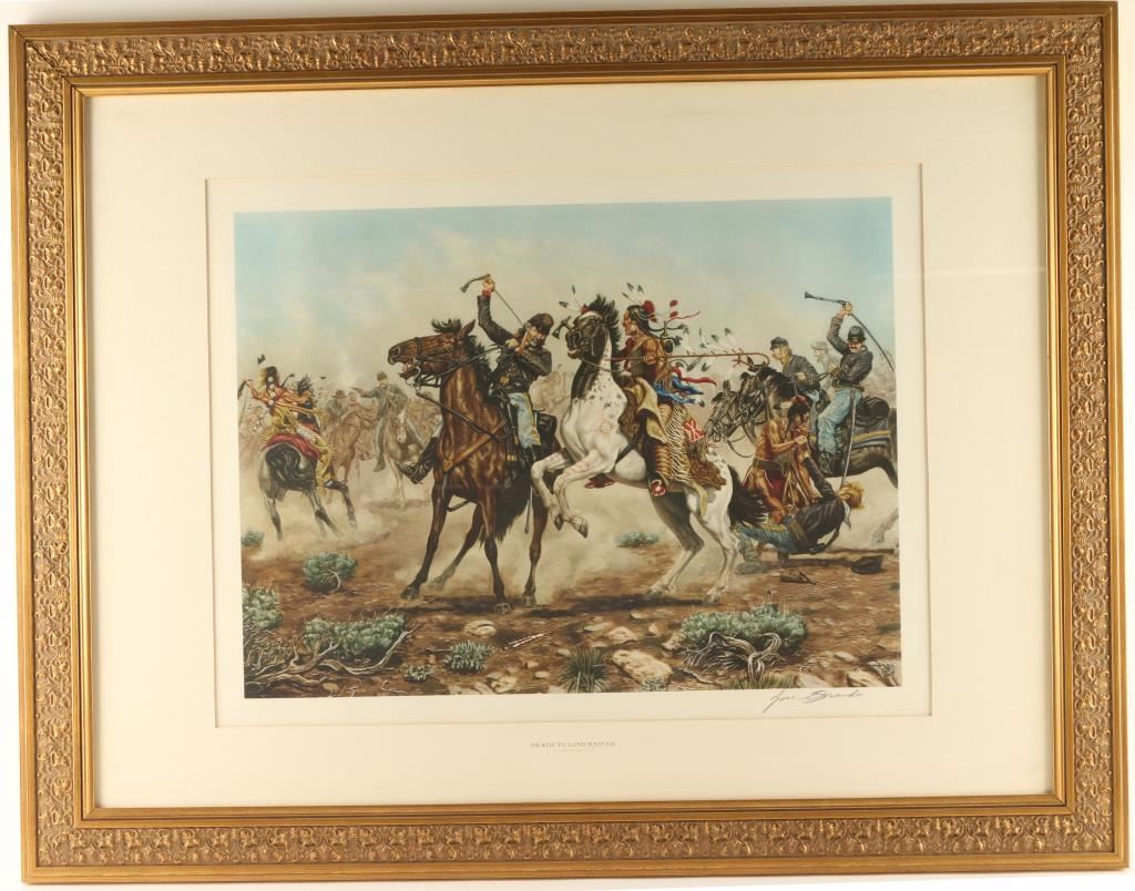 "Death to Long Knives" hand signed in pencil lower right. Image measures 15 3/4" x 21" in single white pebbled mat that has title and artist's name stamped on bottom with molded gold wood frame. Joe Grandee was born as a third generation Texan in Dallas during 1929. He studied at the Aunspaugh Art School in Dallas during 1947. From 1965 to 1991, he was active as a sculptor, illustrator, and painter of portraits, military scenes, and the history of the West. He has been cited for historically accurate depictions of the Dragoons and Cavalrymen of the US Army. In 1974, he was honored with a one man retrospective in the US Capitol. Additionally, he served for one year as the "Official State Artist of Texas" - an appointment by the Texas Legislature. His work has been exhibited by the White House, Lyndon Baines Johnson Collection [Austin],the Harmsen Collection of Western Art [Denver], and the National Cowboy Hall of Fame [Oklahoma City]. His original works are rare and valuable.