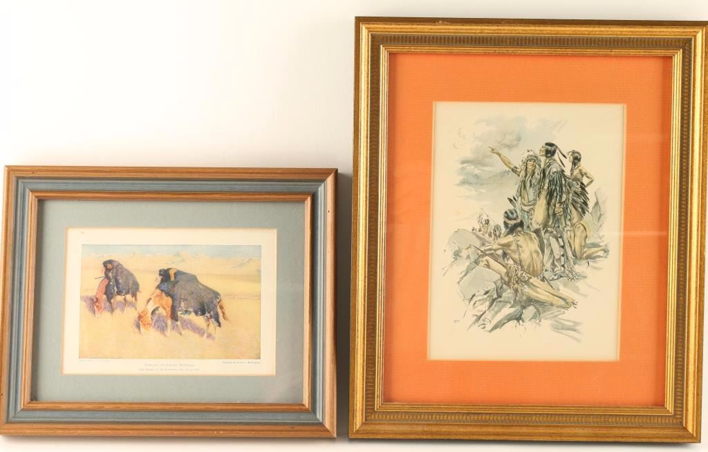 (1) Frederic Remington "Indians Stalking Buffalo". Image measures 3 1/4"x5 1/4" in single mat with wood frame. (1) Harrison Fisher depicting Chief giving his braves directions. Image measures 7"x5" in single mat with gold wood frame.