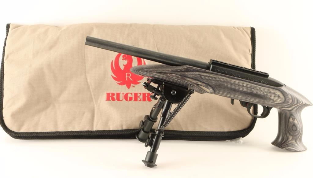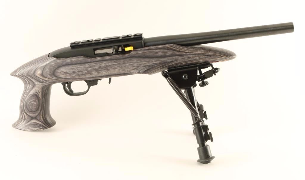 Pistol variation of the magazine-fed semi-automatic 10/22 chambered in .22 Long Rifle, circa 2012. Features a blued/black finish, 10" barrel with no provisions for sights, installed scope rail, factory 10 round rotary magazine, adjustable bipod, push button safety, smooth charging handle, stair step textured trigger, and one-piece smooth grey laminated wood pistol grip stock. Includes a factory soft case with lock. Pistol exhibits approximately 99% of it's original finish with only few light handling marks observed. Action is smooth, bore is excellent, and wood stock is fine. Condition is near new. ***Modern Firearm***