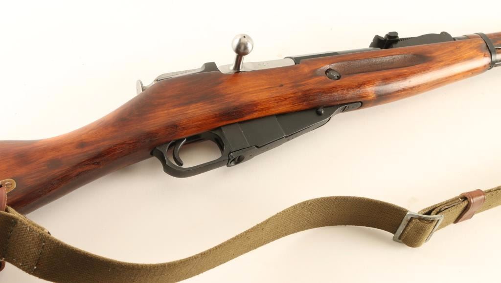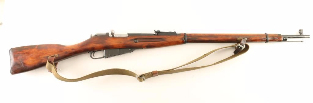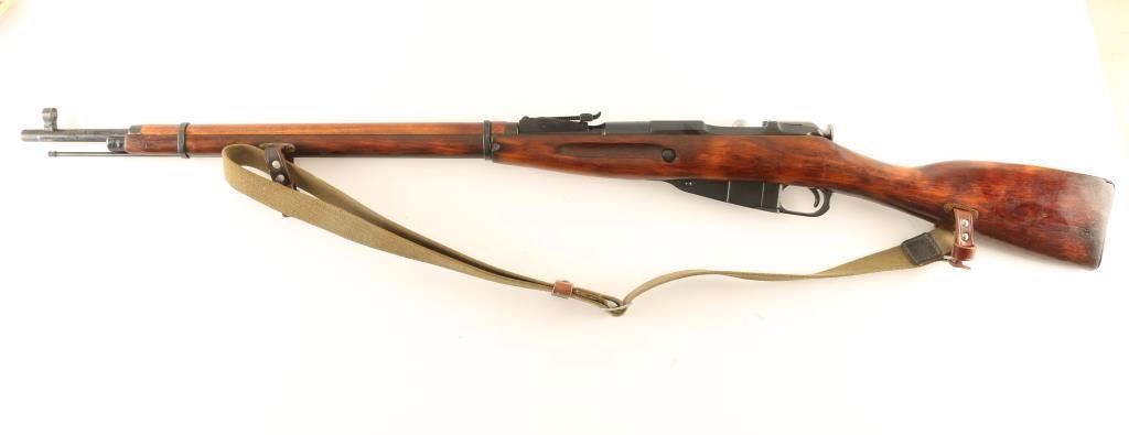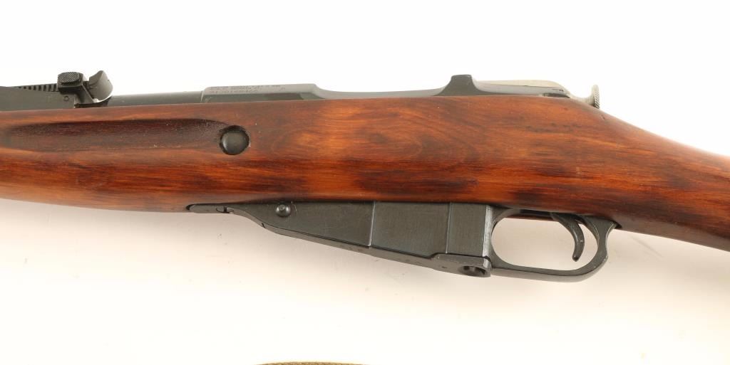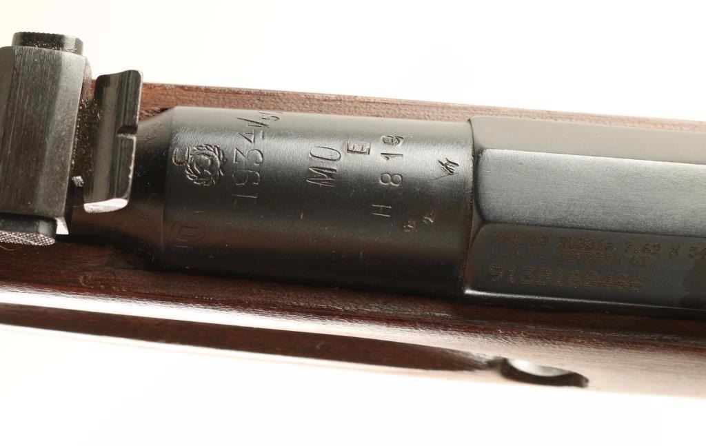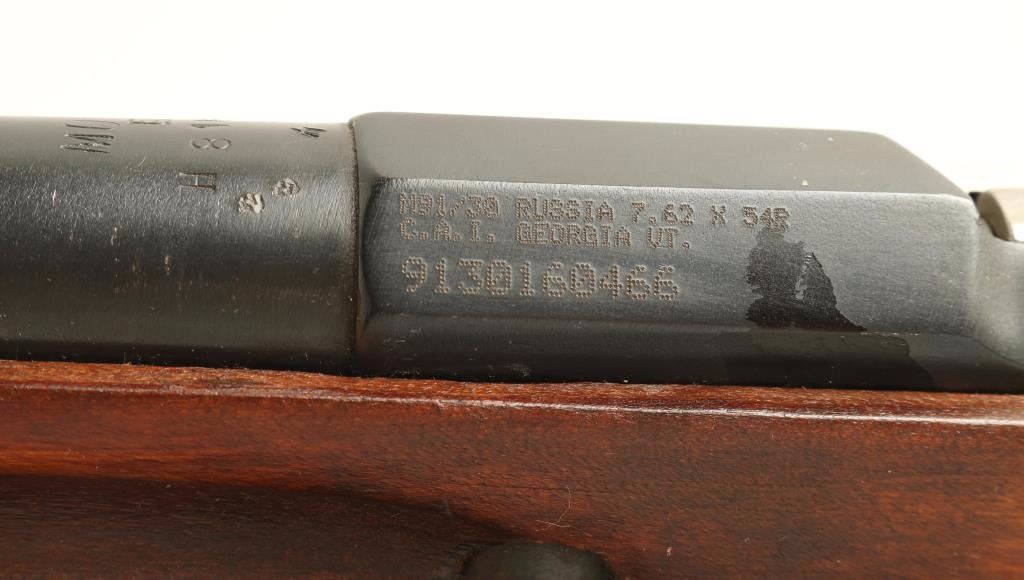 Sn: H819/9130160466 Arsenal refinished Russian military bolt action service rifle chambered in 7.62x54Rmm, circa 1934 with a 1950 secondary date. Imported by C.A.I. of Georgia, V.T. with import marks on the receiver. Featured a blued finish with some phosphate finish over the bluing, Izhevsk marked 28.7" tapered barrel, hooded post front sight, graduated rear sight to 2,000 meters, cleaning rod, internal box magazine, straight bolt handle, two barrel bands, green canvas sling, smooth wood handguard and straight grip shoulder stock with metal buttplate. Matching serial numbers on barrel, bolt, floorplate(forced) & buttplate. Rifle retains approximately 96% of it's nicely accomplished refinish showing light wear on the barrel including wear from bayonet installation. Action is smooth, bore is dull with good rifling and wood stocks are near fine with few imperfections. Condition is very good+++. ***C&R Firearm*** ***Modern Firearm***