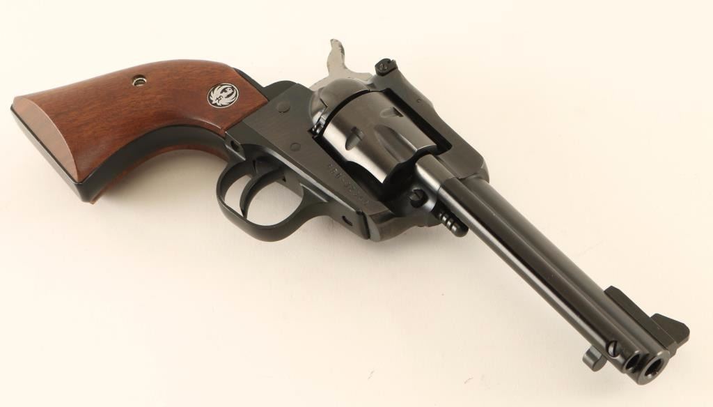 SN: 650-32340 'SSM' Small frame single-action revolver chambered in .32 Harrington & Richardson Magnum, circa 1991. Features a blued finish, 4 5/8" barrel, raised ramp front sight, adjustable rear window sight, ejector rod, fluted six-shot cylinder, transfer bar safety, smooth trigger, serrated hammer spur, black finished alloy grip frame and two-piece smooth walnut grips with Ruger medallions. Includes a factory cardboard box with manual. Revolver exhibits approximately 97% of it's original finish showing light handling marks, some minor blemishes and a light drag line on the cylinder. Action is crisp with tight lock-up, bore is excellent and wood grips are fine. Condition is excellent in box. ***Modern Firearm***