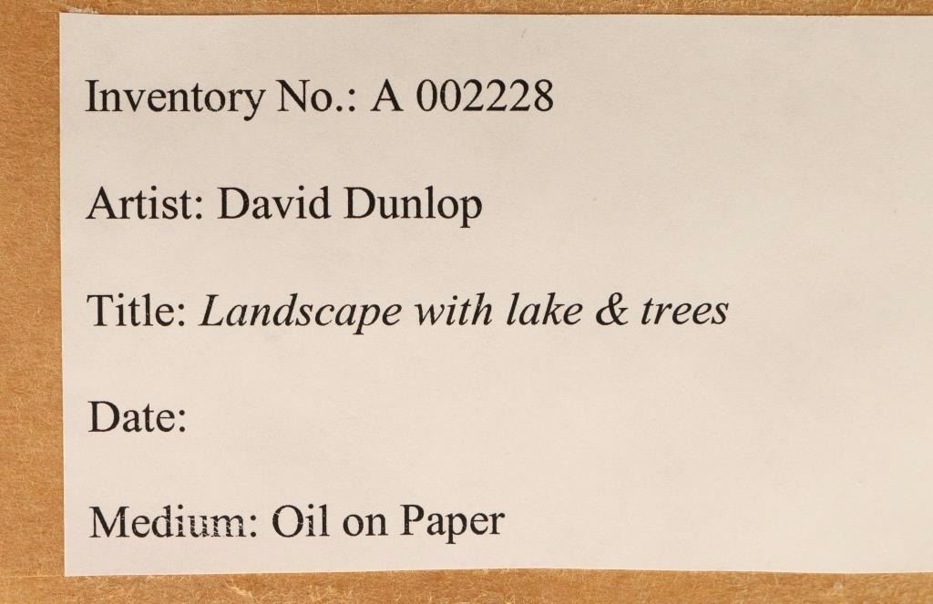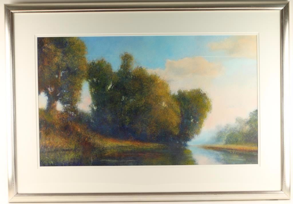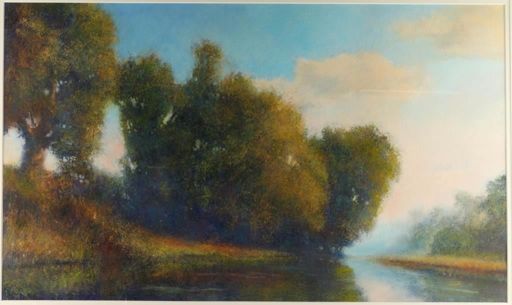 David Dunlop artist entitled "Landscape with Lake and Trees". Image size 36"x22" with white mat and pewter frame. David Dunlop has been a faculty member at the Silvermine School of Art in Norwalk, Connecticut since 1993 and serves currently on their board of directors. His work is nationally known and featured in many prominent collections throughout the country. He uses painting techniques dating back to the old masters of the Renaissance, frequently employing a 14th century method of painting on gold leaf. He has created a selection of instructional DVDs on the topic of acrylic, watercolor and oil painting. Dunlop is also working with PBS on a pilot project offering art history and instruction. He has lectured at several museums and conducted plein-air workshops.