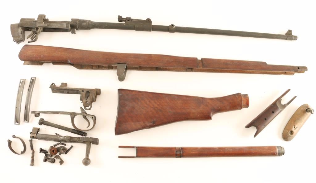 Disassembled Austrian made bolt action service rifle chambered in .303 British, circa 1941. Rifle when assembled features a parkerized finish, 25.2" barrel, shrouded blade front sight, winged rear tangent sight graduated to 2,000 meters, bayonet lug, sling swivels, stripper clip guide, no magazine, serrated trigger, manual safety, brass trapdoor buttplate and smooth full length wood stocks. No import marks observed but the proof marks indicate that it was refurbished by the factory with a 1952 dated barrel. Finish appears to be approximately 60% intact, bore is dark with sharp rifling and wood stocks are very good. Condition is very good as a project gun. ***C&R Firearm*** ***Modern Firearm***
