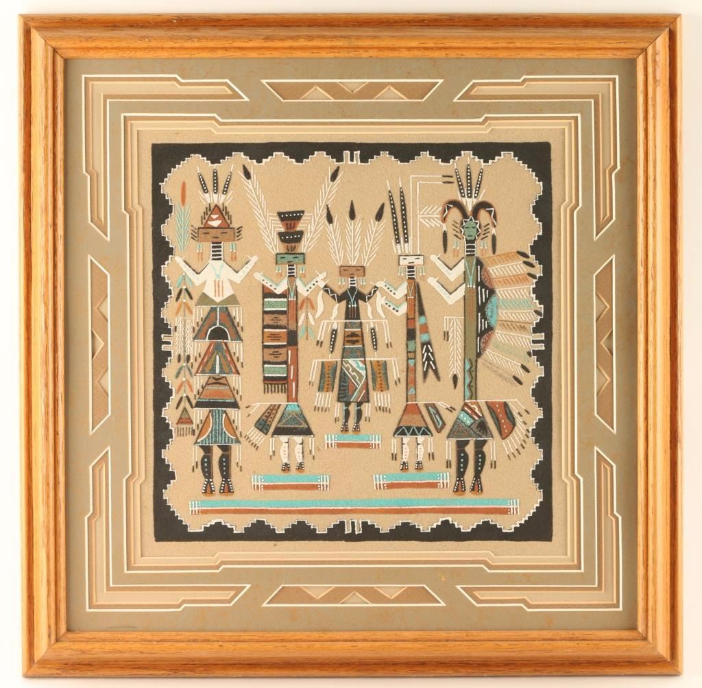Colorful Yei Be Chais with a black geometric border. Image measures 11"x11" in double mat with laser cut geometric designs in a wood frame. Very nice presentation.