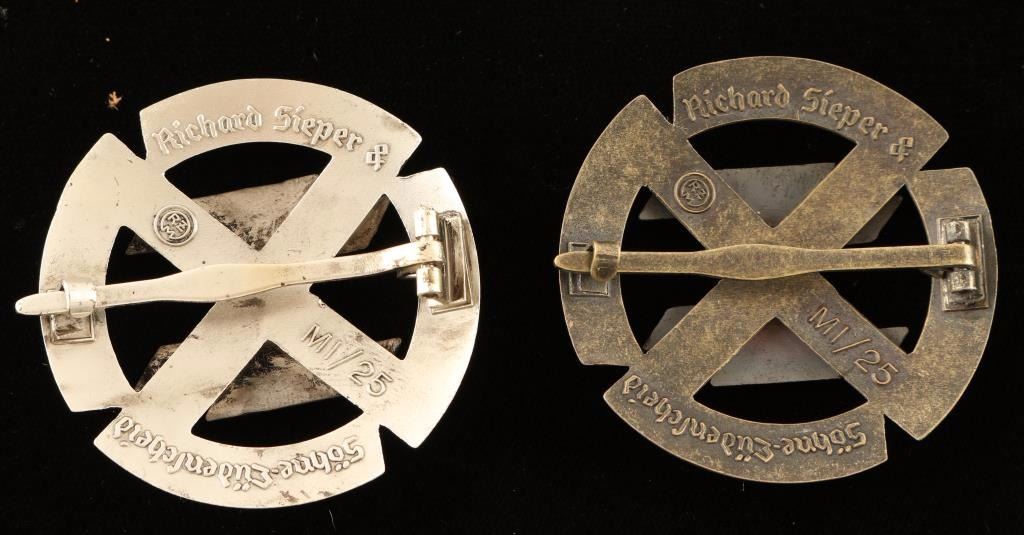 SS Bronze and Silver Runic Badges. Both are maker marked 'Richard Sieper & Sohne Ludenscheid RZM M1/25'. They have a wide horizontal pin back. As is unknown age.