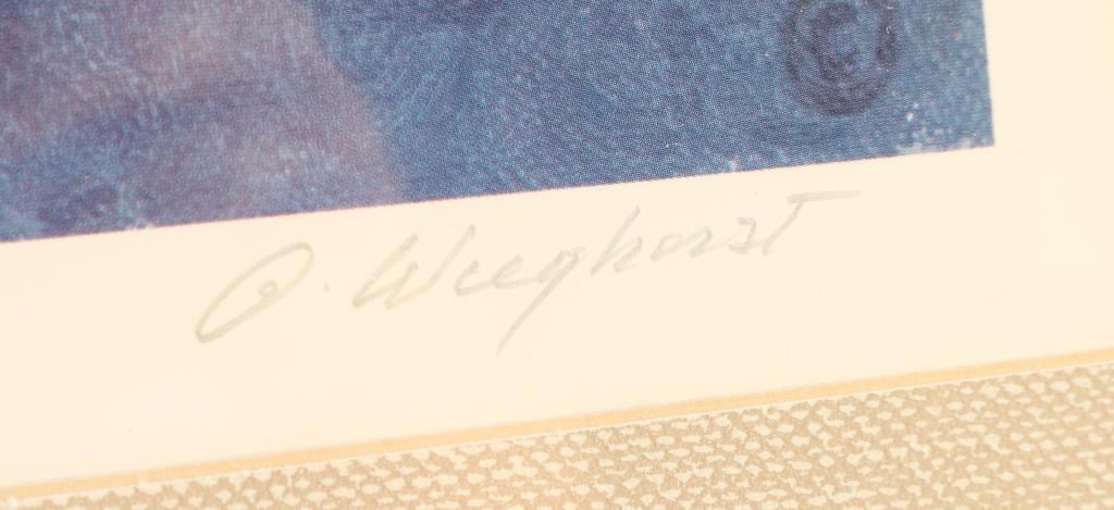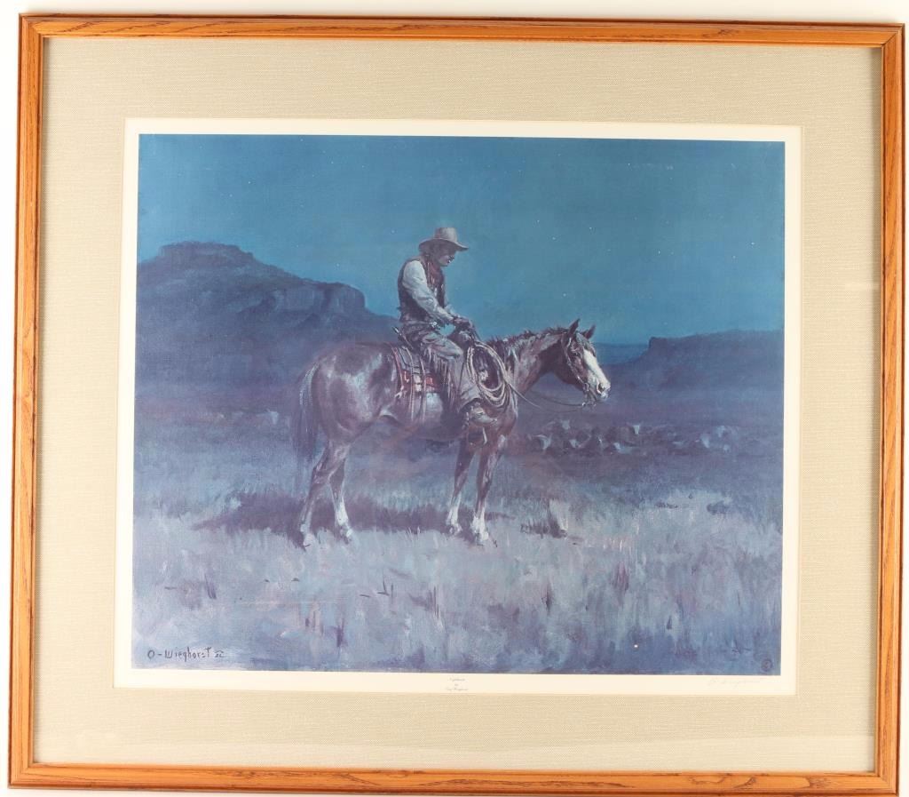 "Nighthawk" 306/999, signature lower right. Image measures 25"x21" in textured mat with wood frame. Olaf Wieghorst arrived in the U.S. in 1918, joining the U.S. Cavalry, & patrolled the Mexico border in New Mexico & Arizona . When he mustered out of the army, he drifted, ending up as a wrangler on the Cunningham Ranch near Alma, New Mexico. By the mid-twenties, Wieghorst was in New York City, working as a mounted policeman - his relationships with the many horses that were a part of his life became the common denominator of his paintings. Living in California by the end of WWII, he began a career that spiraled to success, in part due to his engaging personality. His paintings have appeared in numerous solo & retrospective exhibitions including the National Cowboy & Western Heritage Museum, Oklahoma City (1974), The Tucson Museum of Art, Arizona (1981), & the San Diego Historical Society, California (2002).