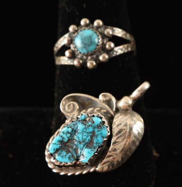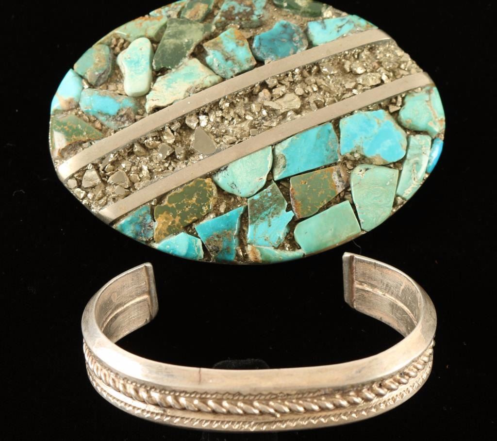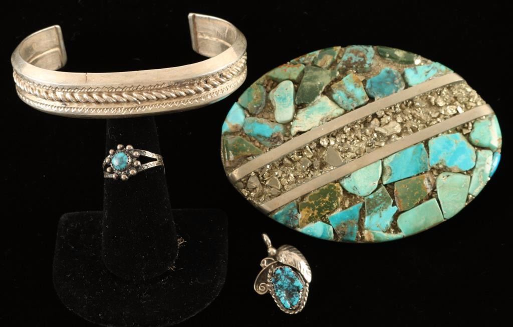 Silver belt buckle handsomely overlaid with turquoise stones and sparkling stones signed 'AK'. Thick metal cuff with rope engraving across the middle, and a pair of signed petite jewelry pieces-child's ring with a colorful turquoise stone and pendant with a turquoise stone eclipsed with a silver leaf and rope design in silver.