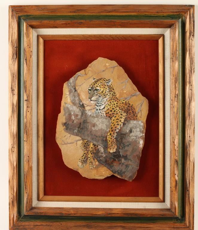 Image of a leopard laying in a tree. Signed lower right. Mounted on rust velvet in a wood frame with a linen inset. Image measures 9"x6 1/2".