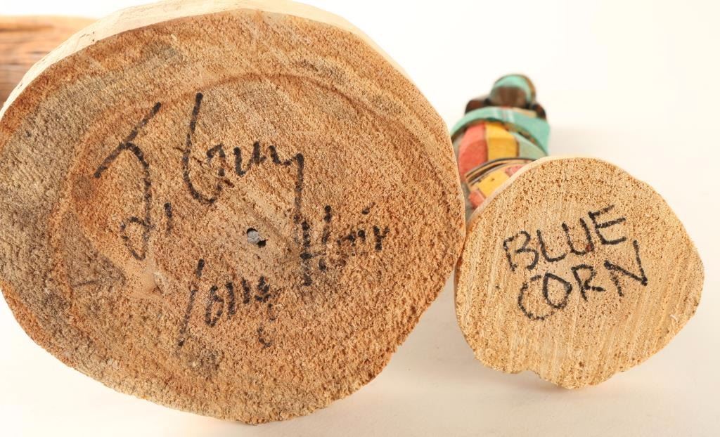 "Long Hair" by J. Guy measures 16"h x 7"w on 5"dia base and "Blue Corn" unsigned, measures 10 1/4"h x 2 1/2"dia. Both carved from a single piece of wood and painted.