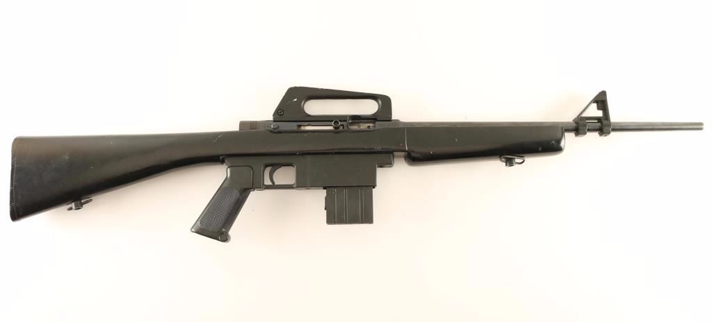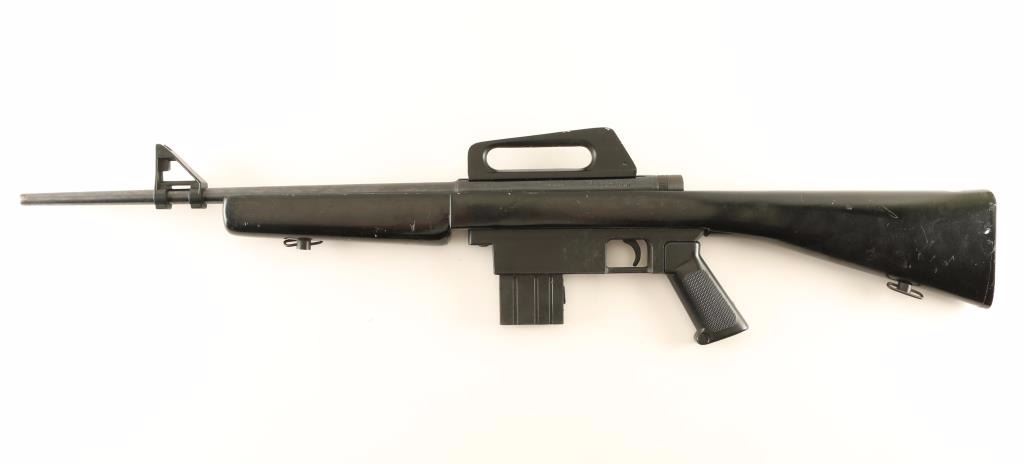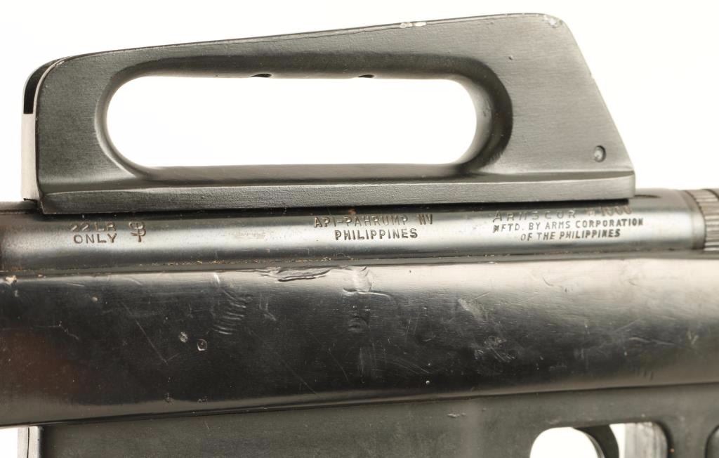 Filipino made semi-automatic rifle chambered in .22 Long Rifle, made to resemble a M16. Imported by A.P.I. of Pahrump, N.V. with import marks on the receiver. Features a blued/black finish, 18.25" barrel, A1 style front sight, removable carrying handle with adjustable aperture sight, 10 round magazine, serrated trigger, manual safety, shell deflector, serrated cylindrical charging handle, sling swivels, A1 style checkered black synthetic pistol grip, and black painted smooth wood shoulder stock. Rifle exhibits approximately 40% of it's original finish showing scattered oxidation/forming surface rust on the barrel and edge wear/flaking on the black finished surfaces. Action is crisp, bore appears good, and wood stock is good showing several blemishes. Condition is very good+. ***Modern Firearm***