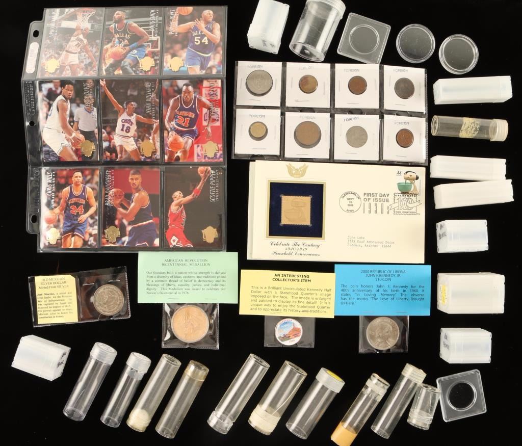 Including; Uncirculated Kennedy Half Dollar with Statehood Image, American Revolution Bicentennial Medallion, 9 Basketball Trader Cards, "Celebrate the Century 1930-1939 Household Conveniences" 24K Commemorative Stamp, 8 Foreign Coins,Old Mexican Silver Dollar, 2000 Republic of Liberia John F. Kennedy, Jr. $10 Coin, and a bag of 25 assorted coin tubes and holders.