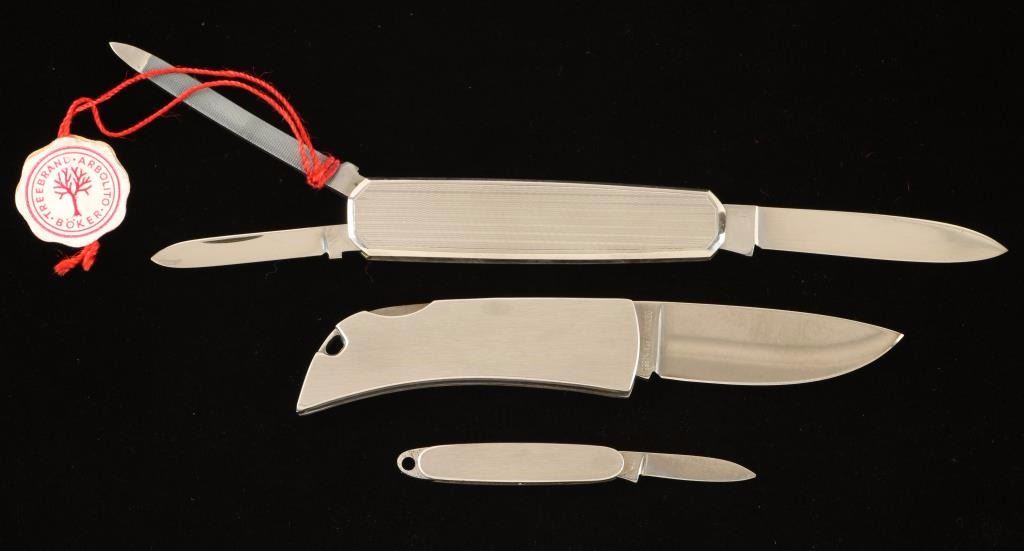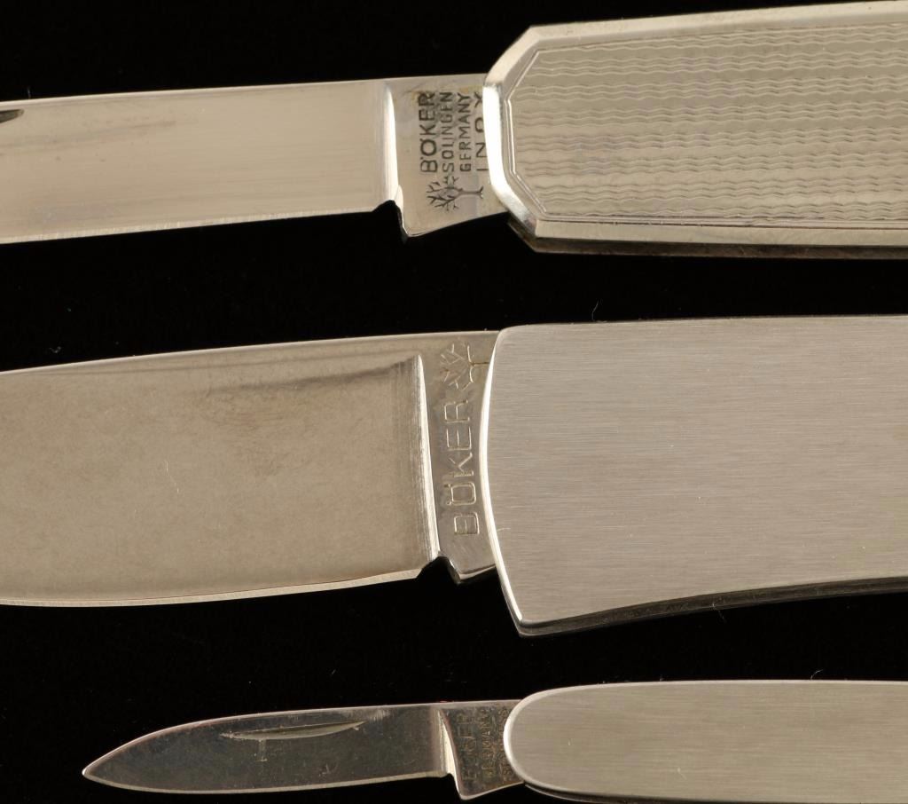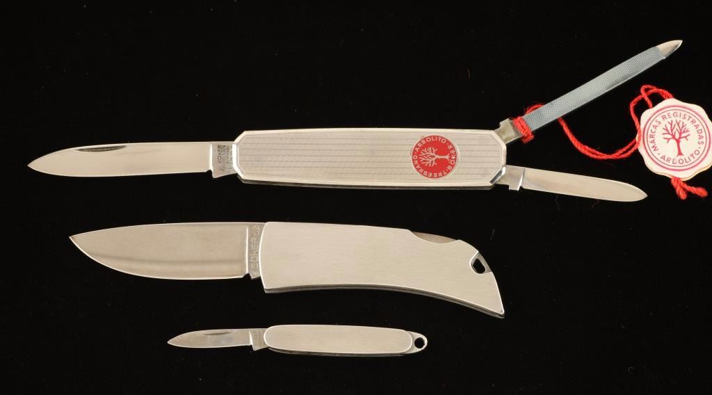 Including; (1) etched stainless steel cased knife with two blades and a file 'Treebrand Arbolito Boker' logo on case, measures 2 3/4" closed. (1) small satin finish case steel lock blade knife measures 4 3/4" overall with a 2" blade. (1) tiny stainless steel satin finish with a single blade measures 1 3/4" closed. All made in Solingen, Germany