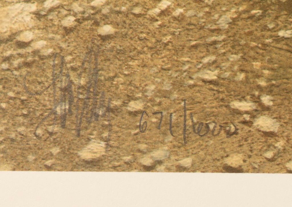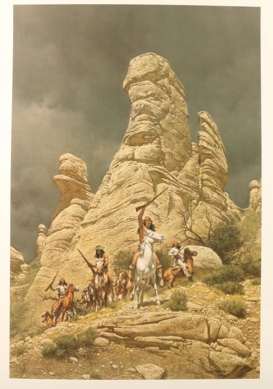 "The Savage Taunt" Tenth Anniversary Print 1974-1984 number 671/1000, hand signed in pencil lower left. Image measures 27"x18". Print only with information on artist in Greenwich Workshop folio. Frank McCarthy was born in New York City and was drawn to the West since he read Will James novels as a boy. He was also intrigued by N.C. Wyeth illustrations. Frank McCarthy's formal training was at the Pratt Institute and had a career in commercial art and as an illustrator. The lure of the West was strong and he eventually settled in Sedona, AZ and became a member of the Cowboy Artists of America. Frank has had several shows in prominent museums and his work has appeared in many national magazines.