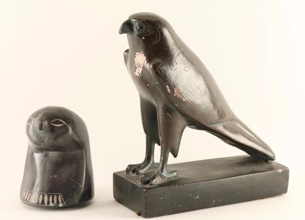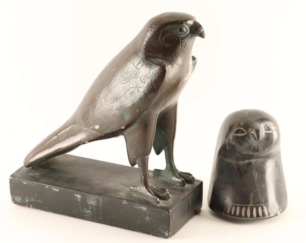 (1) Falcon Resting on Rectangular Base, Bronze Coated Plaster, and (1) Falcon's Head Made of Stone with Carved Accents Around Eyes, Beak and Breast.
