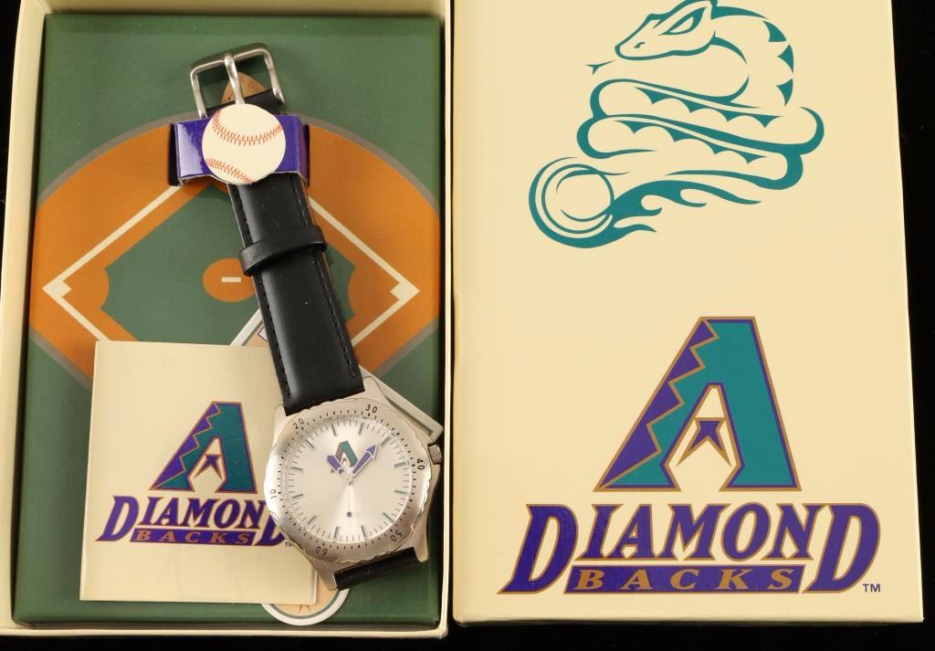 'Limited Series 677/1300' engraved on back with Diamondbackers logo. Black leather strap with silver metal face and bezel with Diamondback logo top center. Purple hour and minute hands. Like new in original box with dust cover. Great gift for the AZ baseball fan. Comes with certificate of authenticity