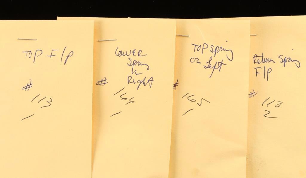 Trigger assembly, Top F/P, Return Spring F/P, Top Spring or left, lower spring right, lower f/p, firing pins, tools, V springs.