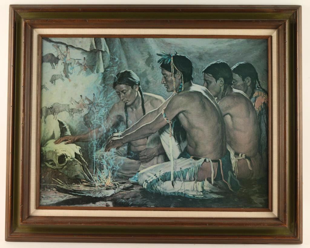 Depicting Indian medicine men. Image size is 18"x24" in green and walnut stained wood frame.