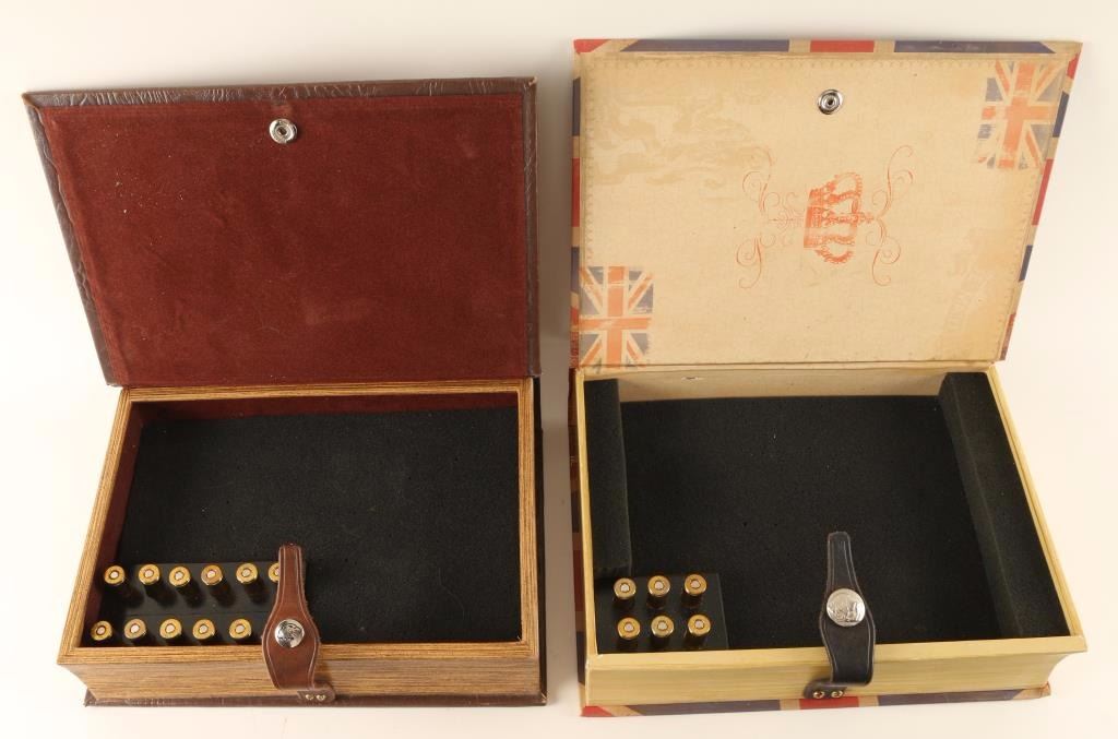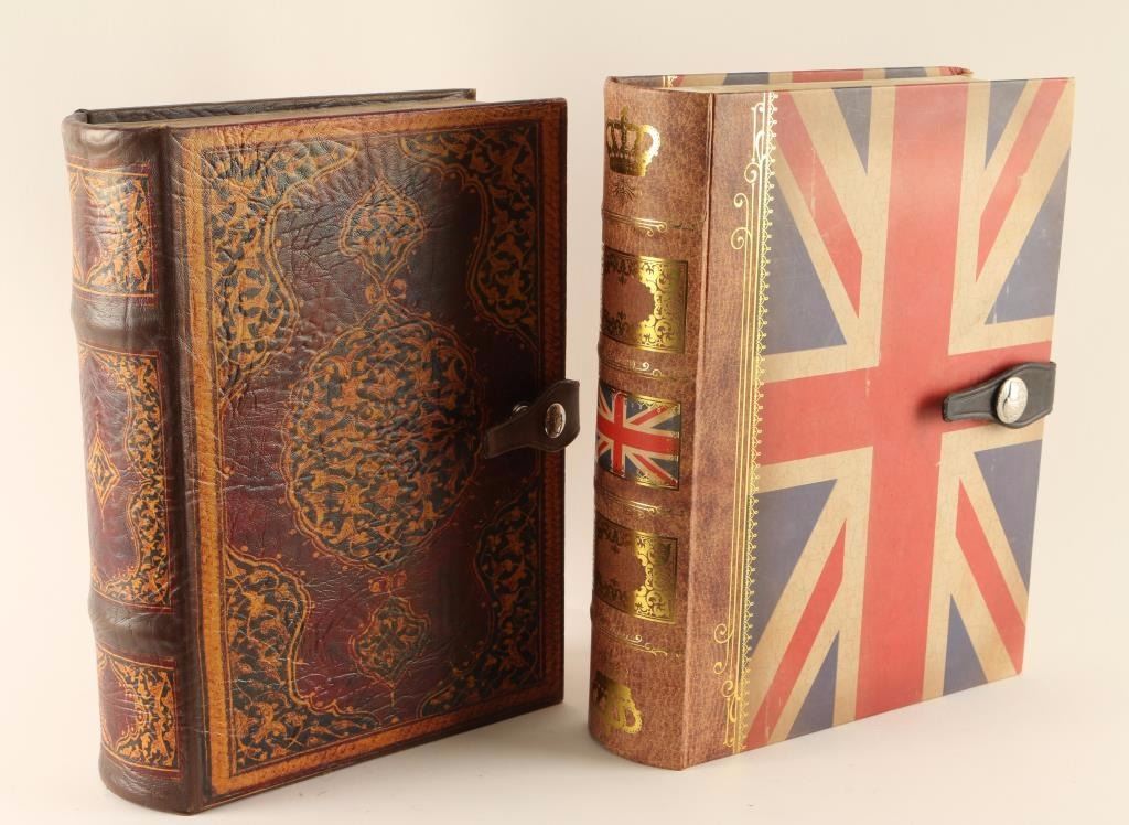 One has an antique book faux leather top, other has a British flag faux leather top.