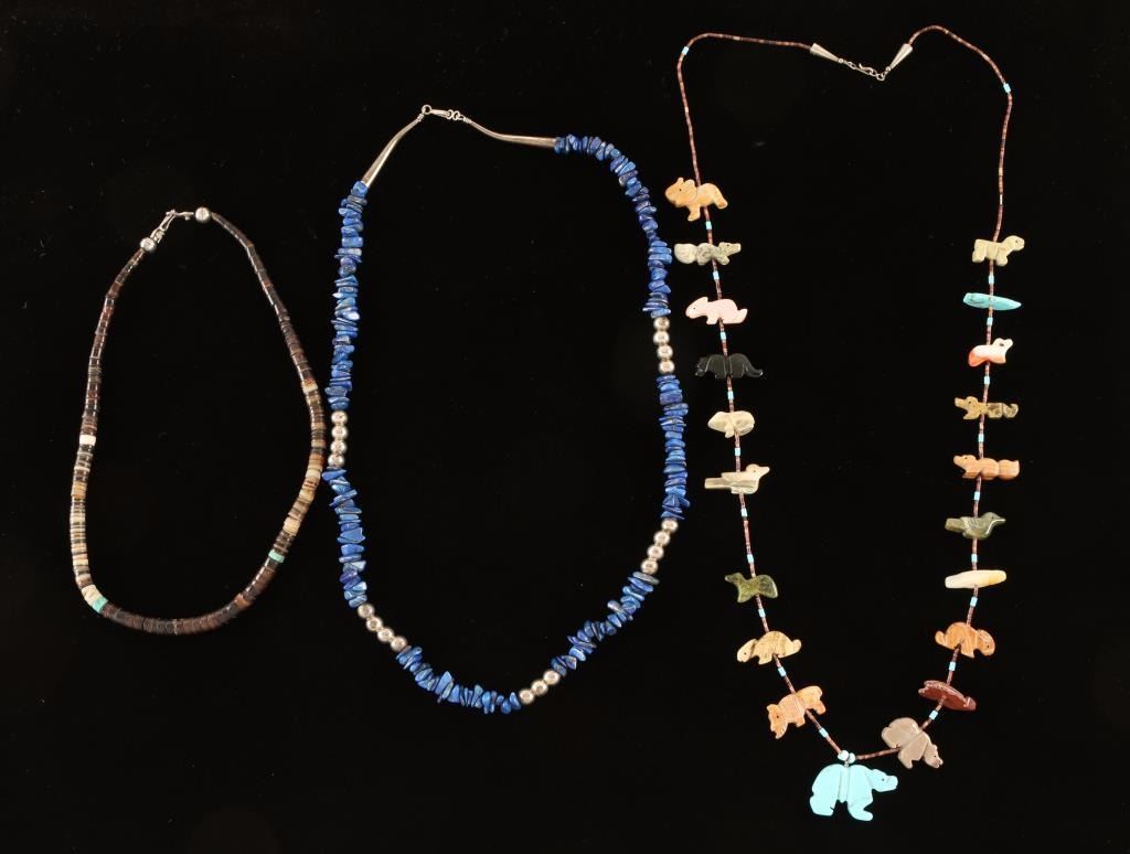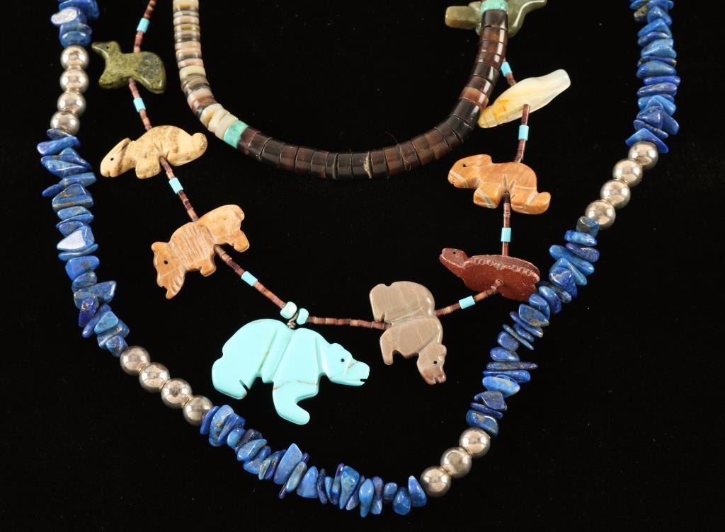 Fetish necklace with large turquoise bear, natural stone and silver bead lapis necklace, and heishi and turquoise stone necklace.