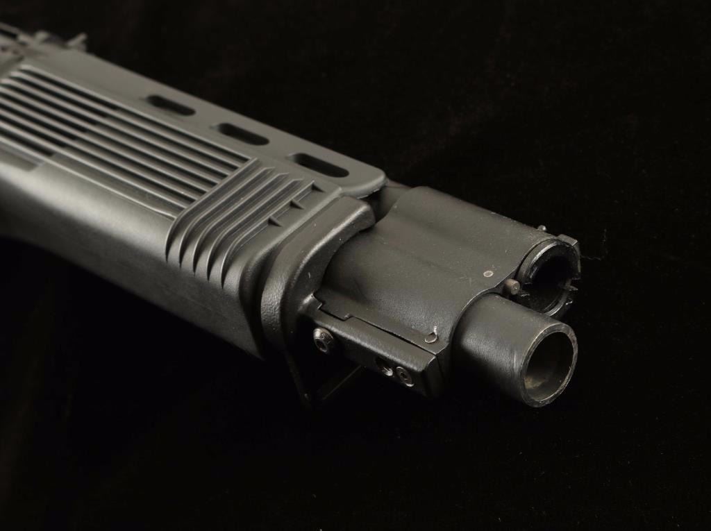 Desirable Russian made semi-automatic AK platform Short Barreled Shotgun with 3" chamber. Features a black matte finish, 10" barrel, bead front sight, dovetailed rear window sight, adjustable gas system, side accessory rail, 5 round factory magazine, grooved black synthetic forend, sling points, factory pistol grip and standard shoulder stock with trapdoor buttplate. Imported by the Fime Group of Las Vegas, N.V. with import marks on the left side of the receiver. Professionally converted by The Riddle of Steel in Dundee, O.R. with marks on the right side of the receiver. Shotgun exhibit approximately 98% of it's original black finish showing only light handling marks. Action is smooth, bore is pristine and synthetic stocks are fine. Believed to be test fired only. Condition is excellent. ***Class III***