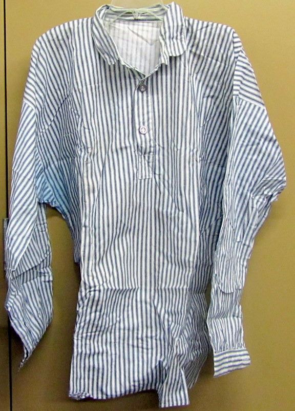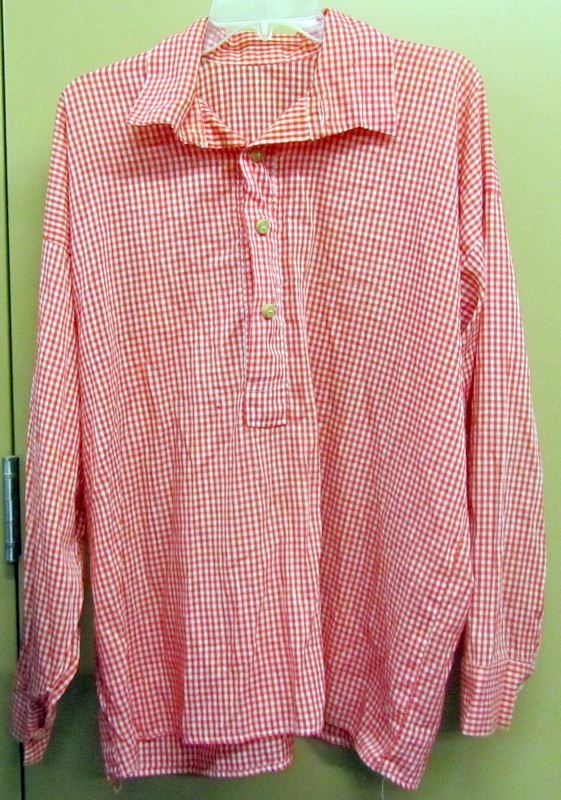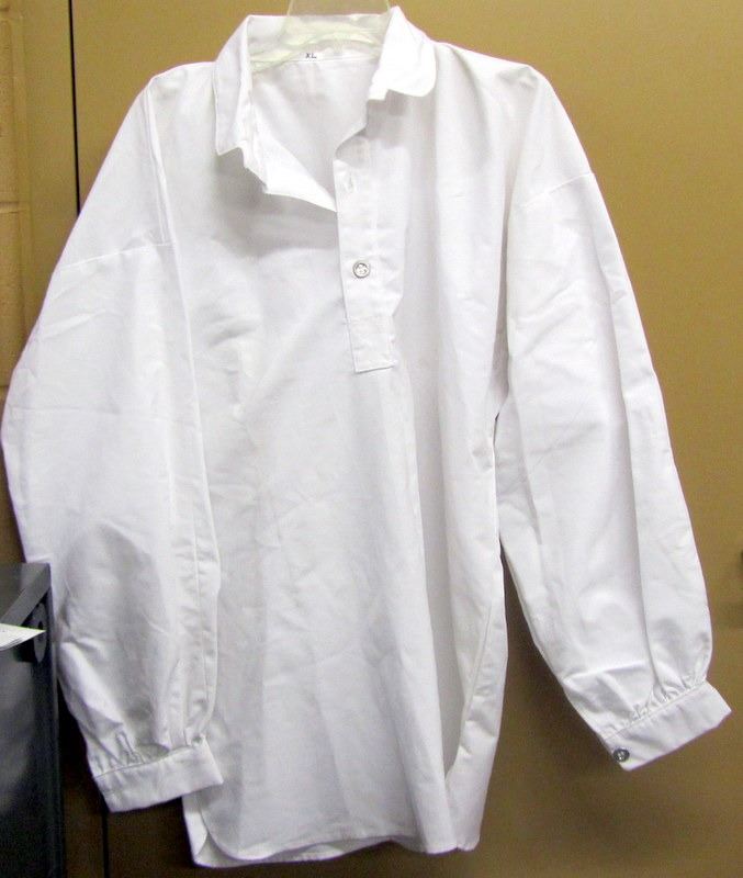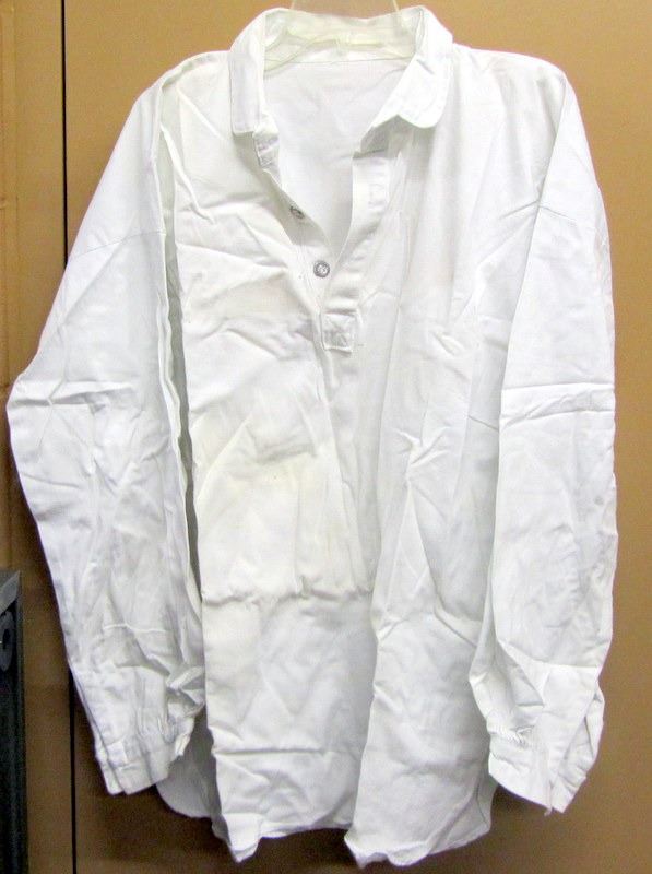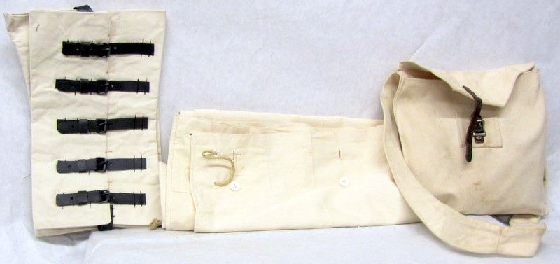 2 WHITE 3 BUTTON SHIRTS 1 WHITE SHIRT HAS DISCOLOURATION, 1 RED CHECKERED SHIRT SMALL HOLE IN FRONT, 1 BLUE STRIPPED SHIRT ALL SIZED XL ,1 CANVAS POUCH, 1 PIECE OF CANVAS 5' X 5' WITH BUTTONS ON 3 SIDES, 1 PAIR CANVAS BOOT COVERS/SPATS, 1 MAROON OFFICERS SASH