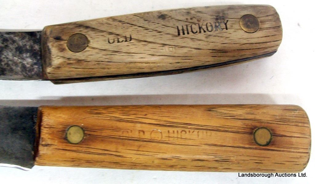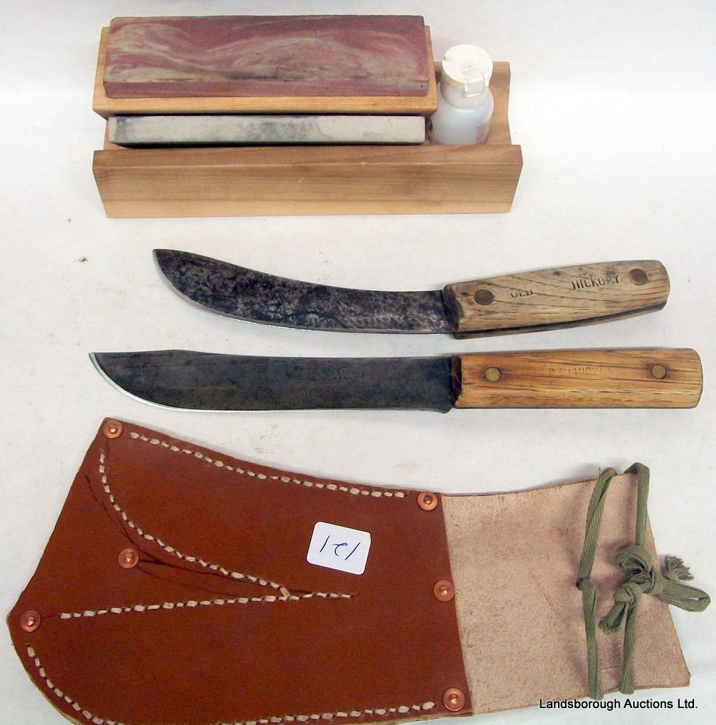 TWO OLD HICKORY KNIVES IN LEATHER SHEATH WITH NORMARK TRI HONE STONE KIT.