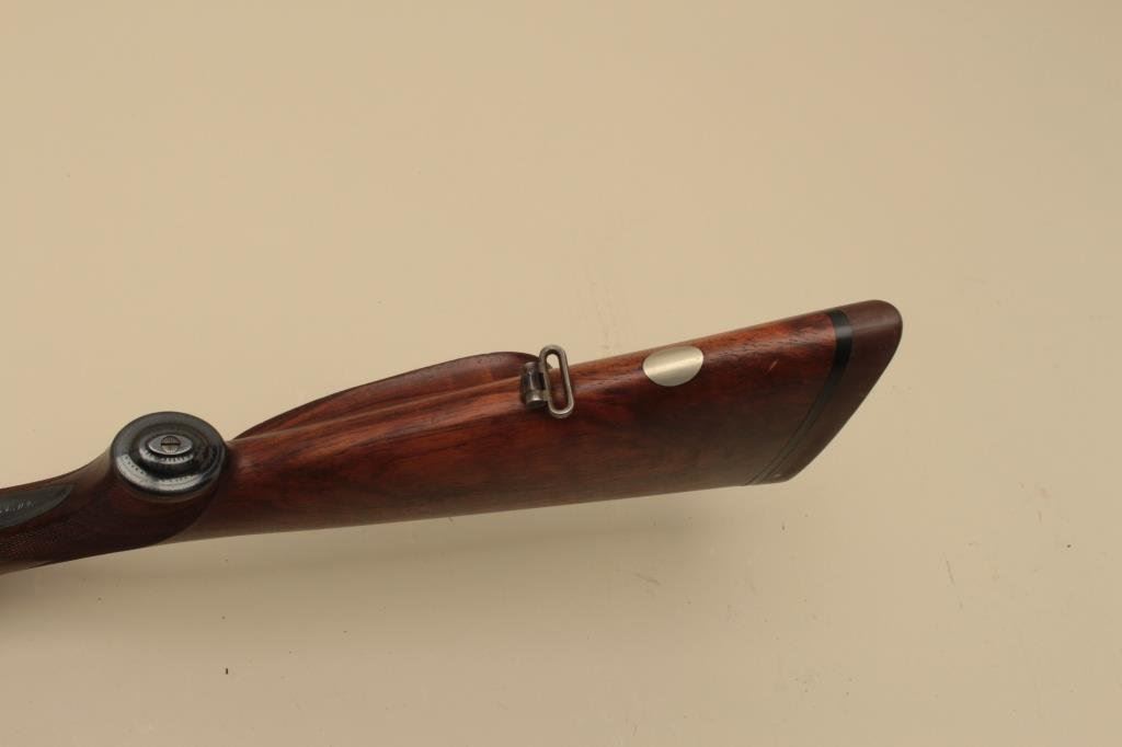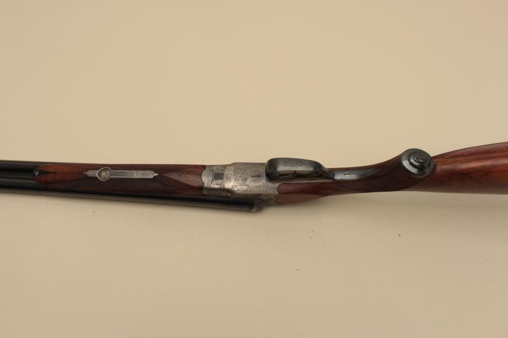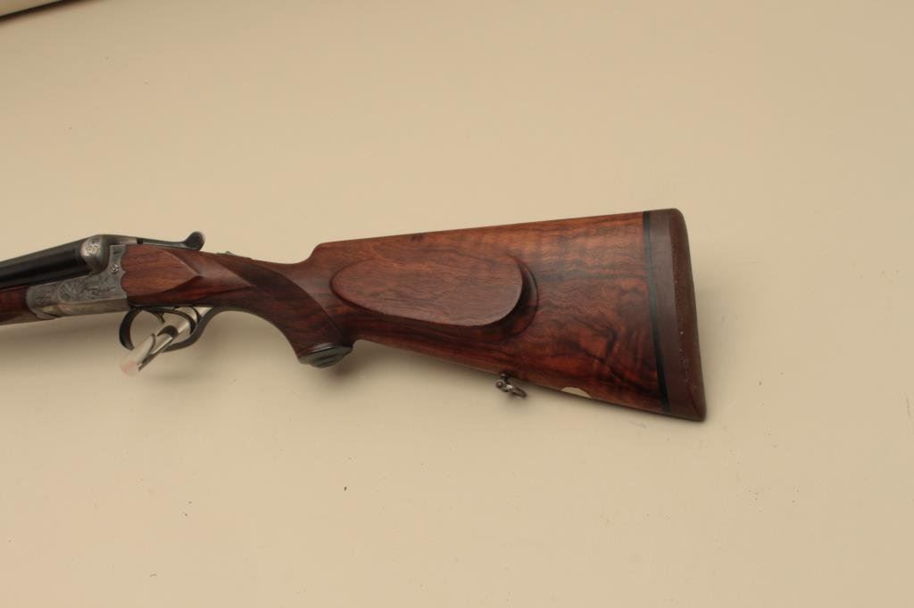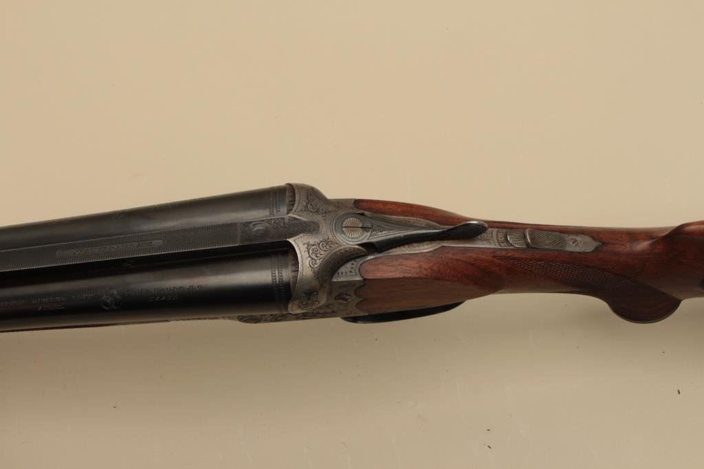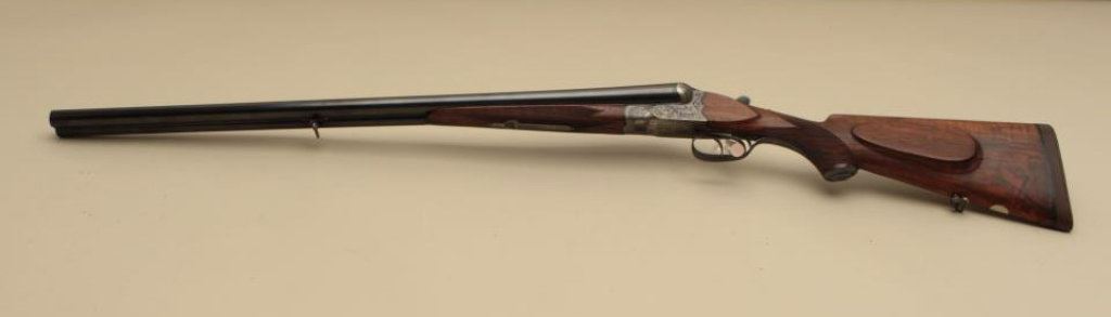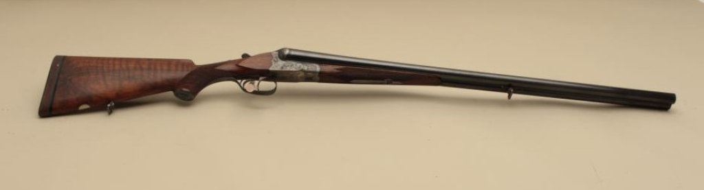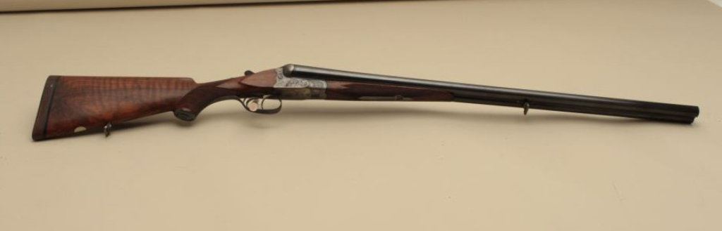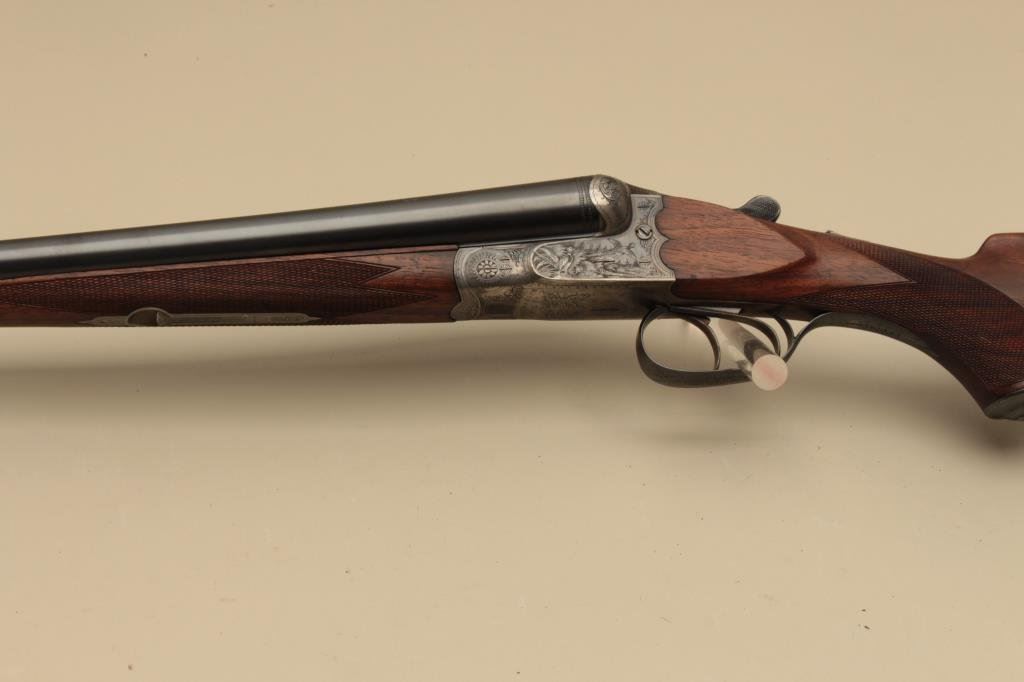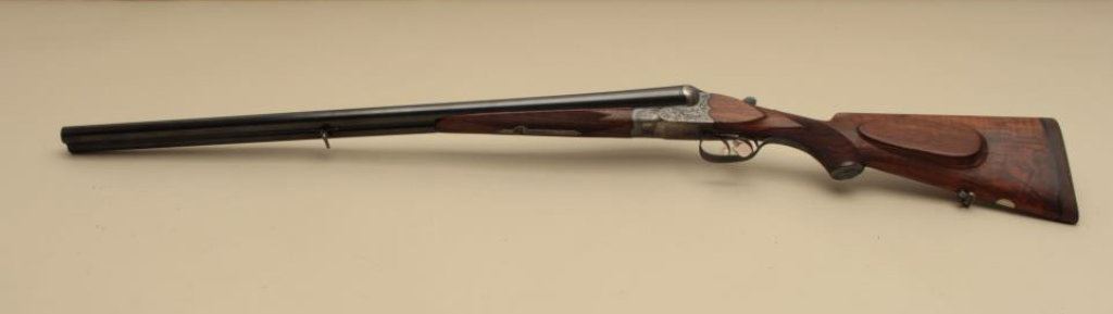 The shotgun is in fine overall condition with 28” barrels with a full-length hand filed rib and steel bead front sight. The Krupp marked barrels retain 95% of their blued finish. The scalloped receiver is beautifully engraved with game scenes and shows significant muted case hardening with a tang mounted safety. The action shows numerous proofs including the Eagle N proof on the barrel flats and features ejectors. The finely checkered wood stock is in very good condition showing light wear from carry and use. The stock shows stunning figure in the butt stock and includes a beaded cheek piece, sling swivels, blank silver escutcheon plate and a red rubber recoil pad providing a 14 ½” LOP to the front trigger. The bores are very good, the action crisp and markings are sharp on this J.P. Sauer of Suhl shotgun. Est.: $600-$1,200. (C+R).