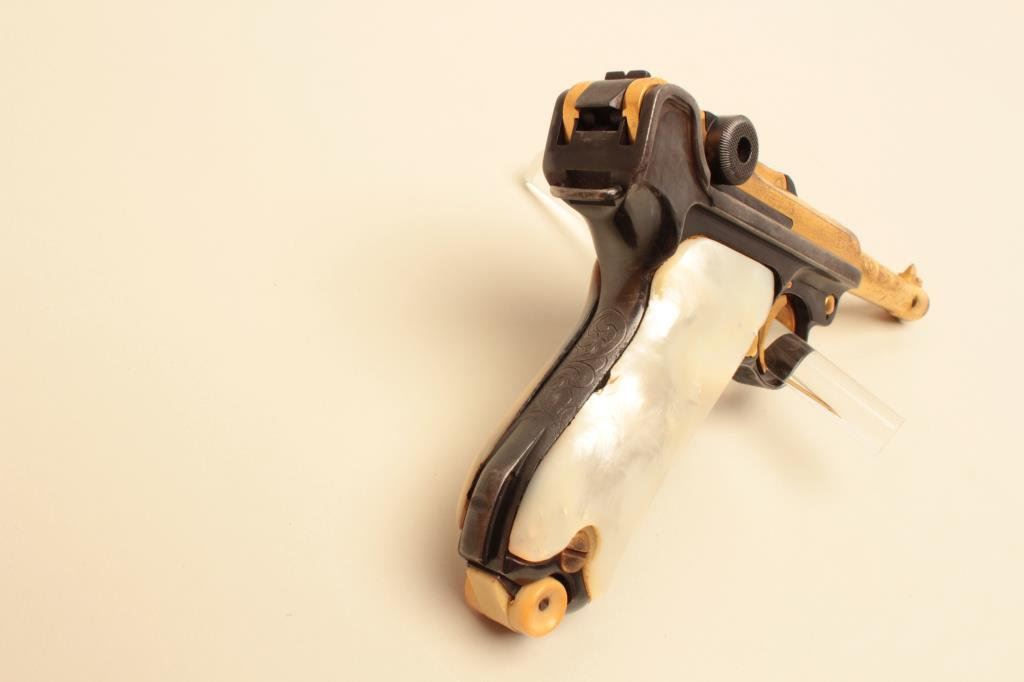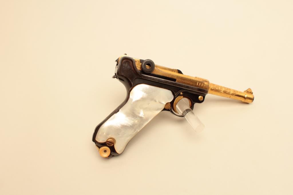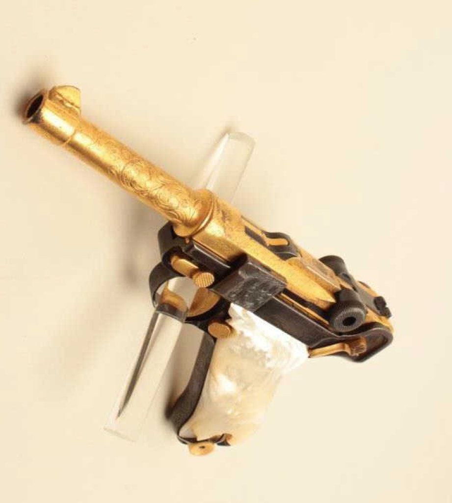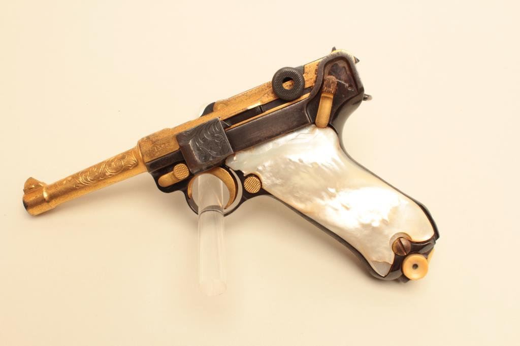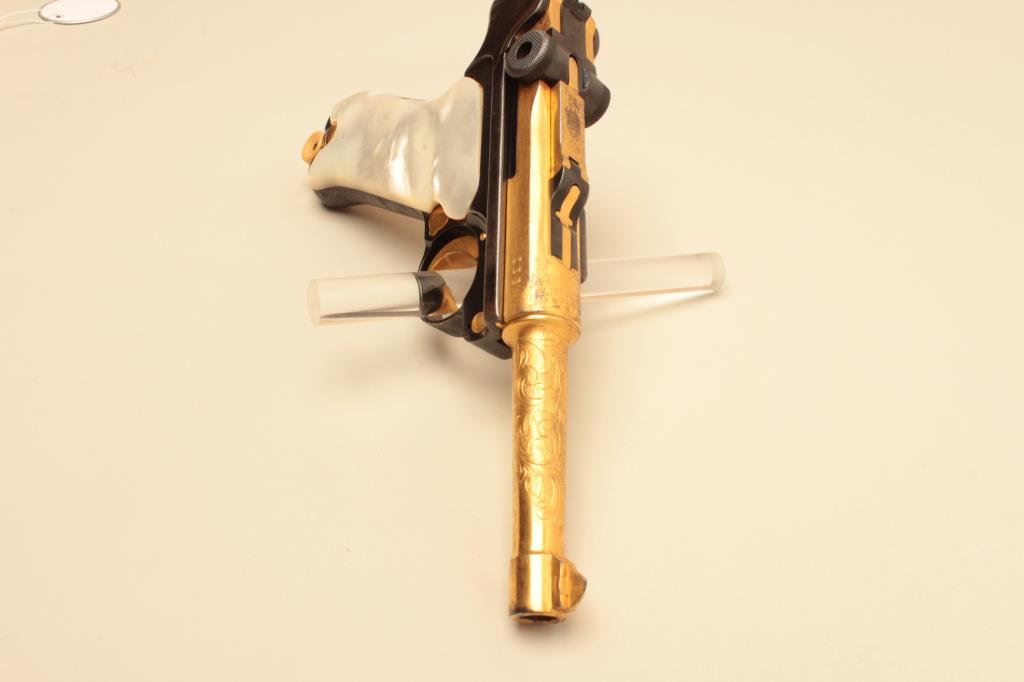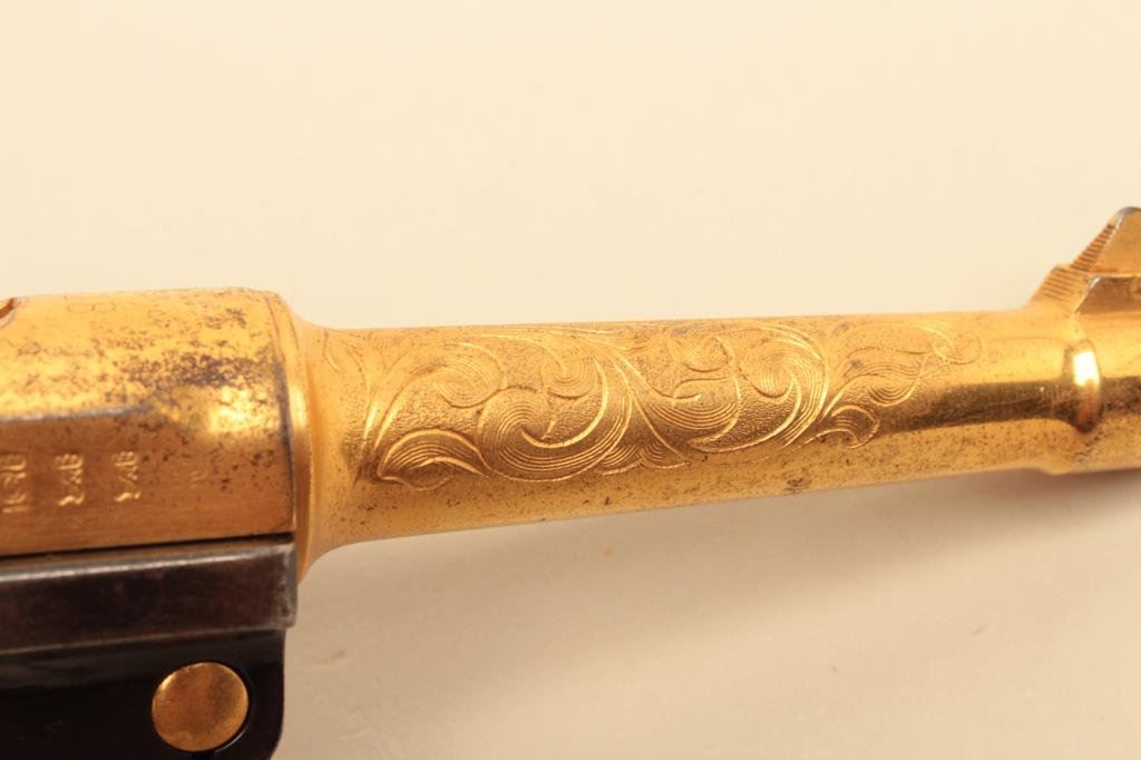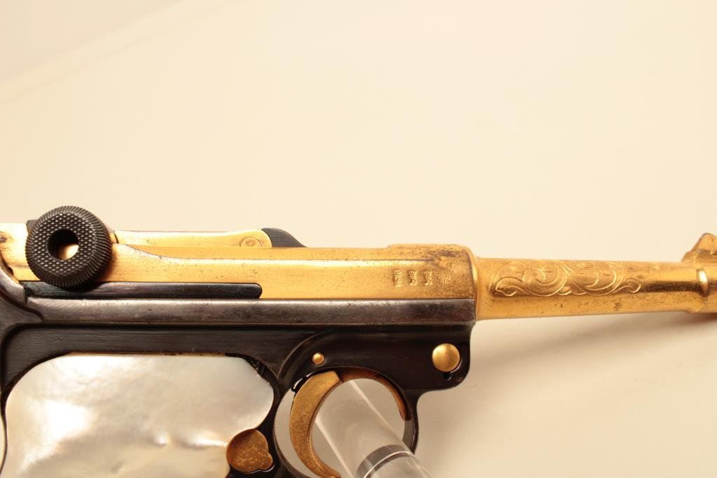 is in good overall condition as re-finished. The barrel is engraved and finished in gold wash with some loss of finish at the muzzle and light surface erosion evident. The pistol features all matching visible serial numbers and the magazine is Nazi proofed. The beautiful pearl grips are old replacements with a small chip at the right toe. The front and back of the grip strap have been engraved as well. The bore is good, action functions and markings are legible. This is an old quality re-finish. Est.: $700-$1,400. (C+R).