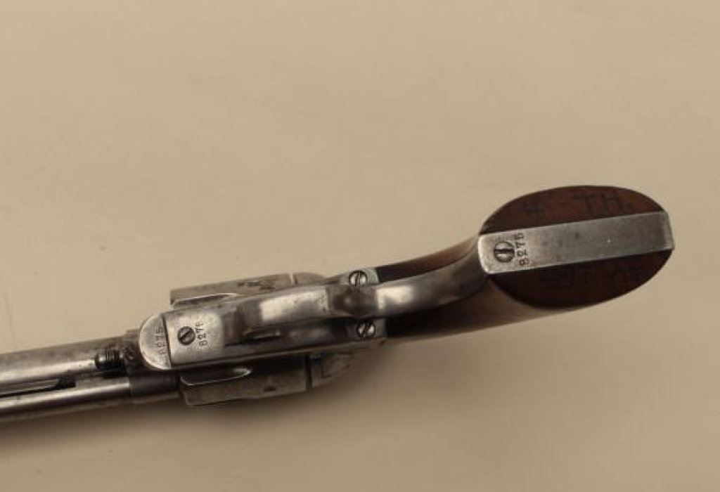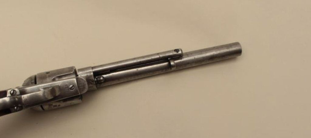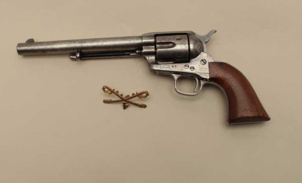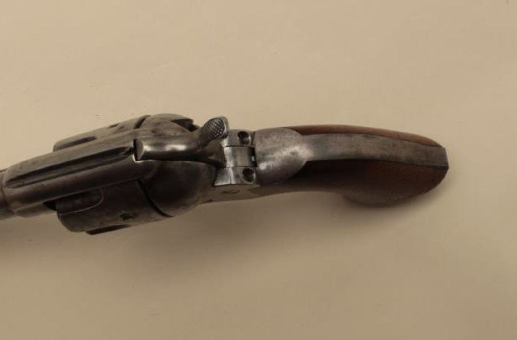 barrel, grey patina, wood grips, S/N 8275 (all matching visible numbers), very good + original condition showing smooth gray metal patina with traces of blue and case colors where protected. Bottom of right grip period carved in block letters “4th” over “SGT. A.C. (for A Company). All correct and matching parts; grips very good + with minor chips and losses but impeccable fit with faint remnants of the outline of the cartouche. Correct hammer, ejector rod housing, pin and small parts. Exceptional bore and crisp hammer with colors showing; sight reduced very slightly. A strong 8 on a 42745 scale; 4th Cav. range which went to Texas and were frontier engagements in the era of Quana Parker. Ex-Chuck Manuel collection (early California collector who collected Colts for over 50 years); his favorite single action revolver sold to a close friend as 1st pick from his collection. This is an honest Ainsworth! Also accompanied by a brass uniform insignia of “4” over crossed sabers.