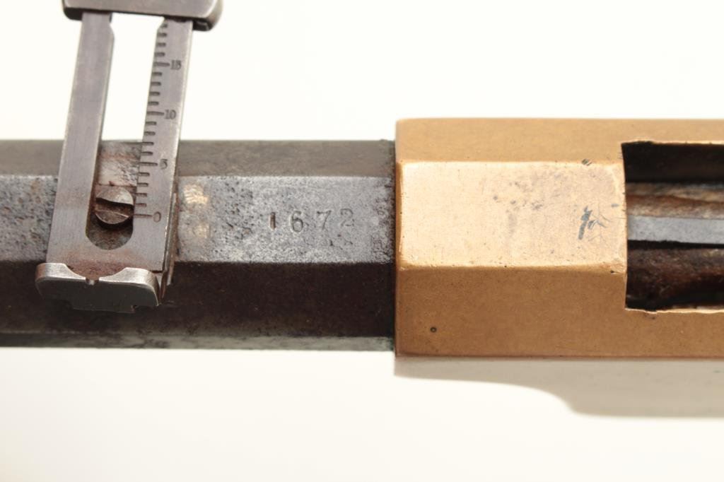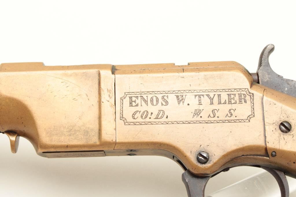 W. Tyler/Co. D/W.S.S.”. This well-known Henry is pictured in Les Quick’s book on Henry rifles from the Doug Beneck Collection. W.S.S.stands for Western Sharpshooters and were the U.S. Volunteers under Lt. Colonel John M. Birge, Commanding. Tyler served with both the 14th Missouri and the 66th Illinois; he was mustered into service on Nov. 9, 1861 and was discharged on Sept. 17, 1864 Birge’s Sharpshooters served at Fort Donelson, TN; Shiloh, TN; Corinth, MS; Resaca, GA; Atlanta, GA; Peach Tree Creek, GA and Jonesboro, GA. Tyler died on Aug. 24, 1903 in Free Soil,MI. This early Henry is in overall good to very good condition showing a beautiful dark patina to the barrel assembly and terrific taffy colored, un-cleaned patina to the brass frame and butt plate; the action is good the bore fair to good and the butt stock is very good +. A great Civil War soldier’s inscribed Henry rifle who belonged to one of the premier Sharpshooter regiments that utilized weaponry